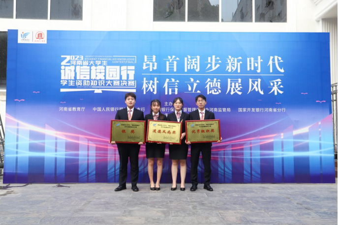 本网讯(特约记者/张卓娅)5月29日-6月1日,2023年河南省大学生“诚信校园行”学生资助知识大赛决赛在南阳理工学院举行。我校选派来自范蠡商学院、张仲景国医国药学院、信息工程学院的安俊丞、令宣华、袁莹莹、袁幽若四名同学组成代表队参加比赛。经过初赛、复赛、决赛的激烈竞争,最终,在全省156所高校代表队中脱颖而出,荣获“银奖”,创下我校在该赛事的历史最佳成绩。同时,我校荣获“道德风尚奖”和“优秀组织奖”,获得奖项数位居全省前列。范蠡商学院张卓娅老师荣获“优秀指导老师”荣誉称号。
