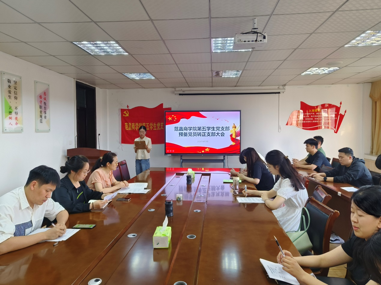 本网讯(通讯员/牛丛丛)6月5日,范蠡商学院第五学生党支部在1331会议室召开预备党员转正大会。本次大会由党支部书记邢红央同志主持,学院副院长李晓方及全体支部党员参加。