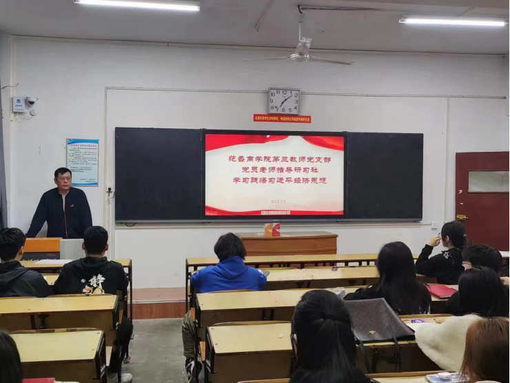 3月9日,范蠡商学院第三教师党支部在一号教学楼开展主题党日活动,党员教师指导习近平经济思想研习社学习活动。支部书记吴信科、第三教师党支部部分党员教师及全体习近平经济思想研习社社员参加本次活动。