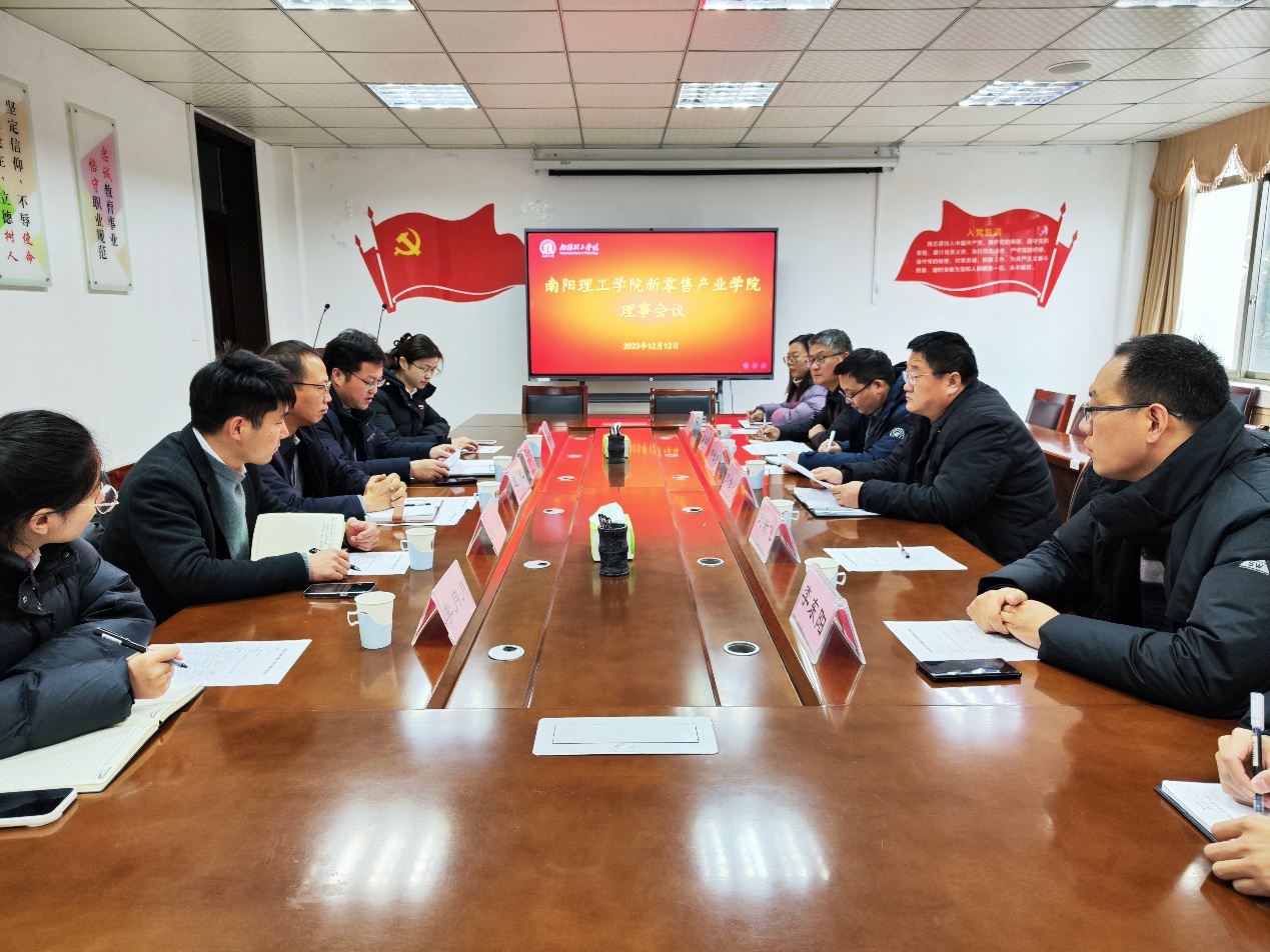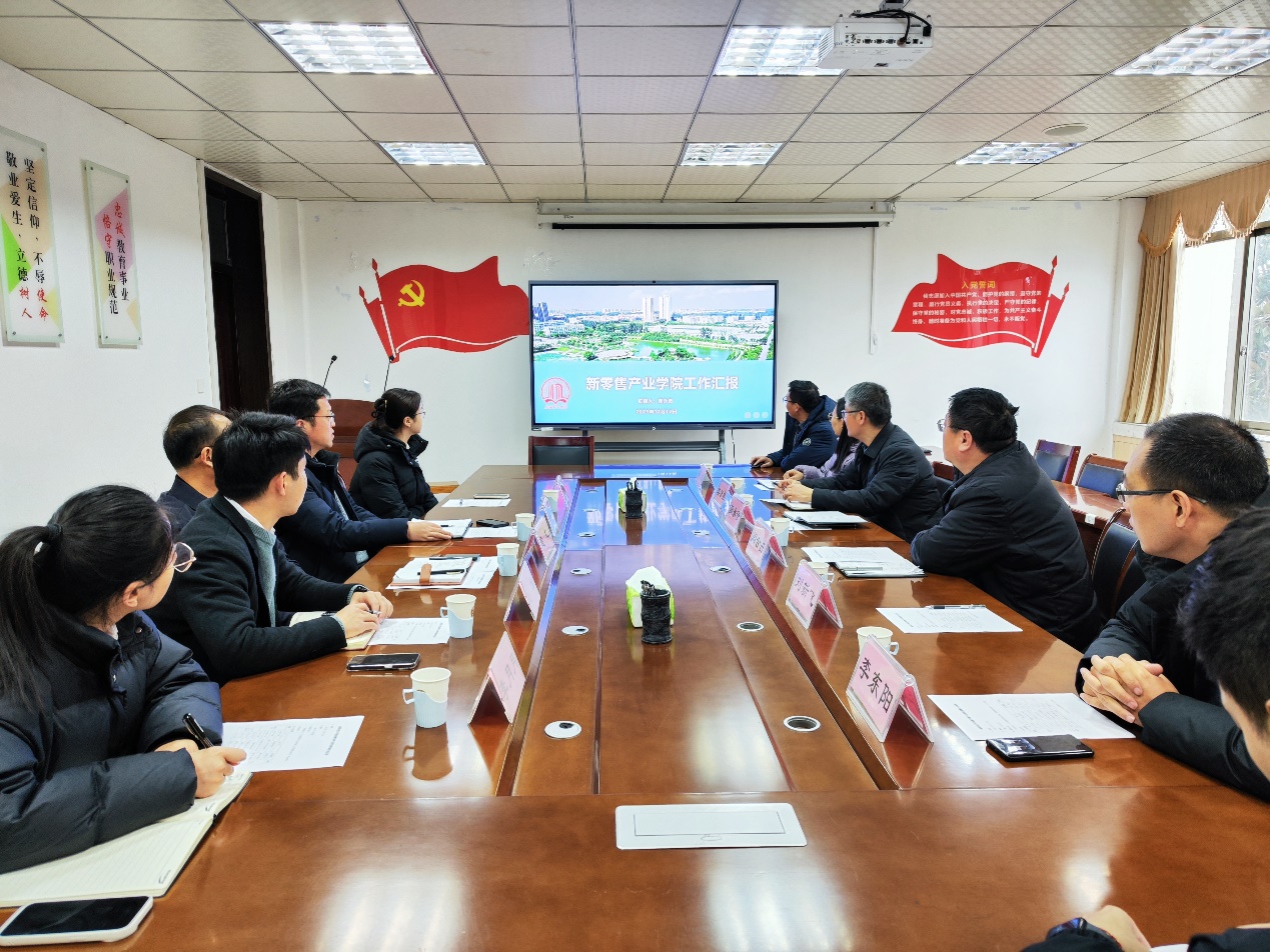 12月12日,范蠡商学院在1教331会议室召开新零售产业学院理事会议暨产业学院工作推进会,发展规划处处长逯忆,产业学院合作企业聚爱数字科技综合办主任程冉、人力资源部负责人李月月,想念集团新零售运营总监刘雄,范蠡商学院院长吴战勇、副院长郭永奇,以及产业学院全体教师参加会议,范蠡商学院书记闫合占主持会议。