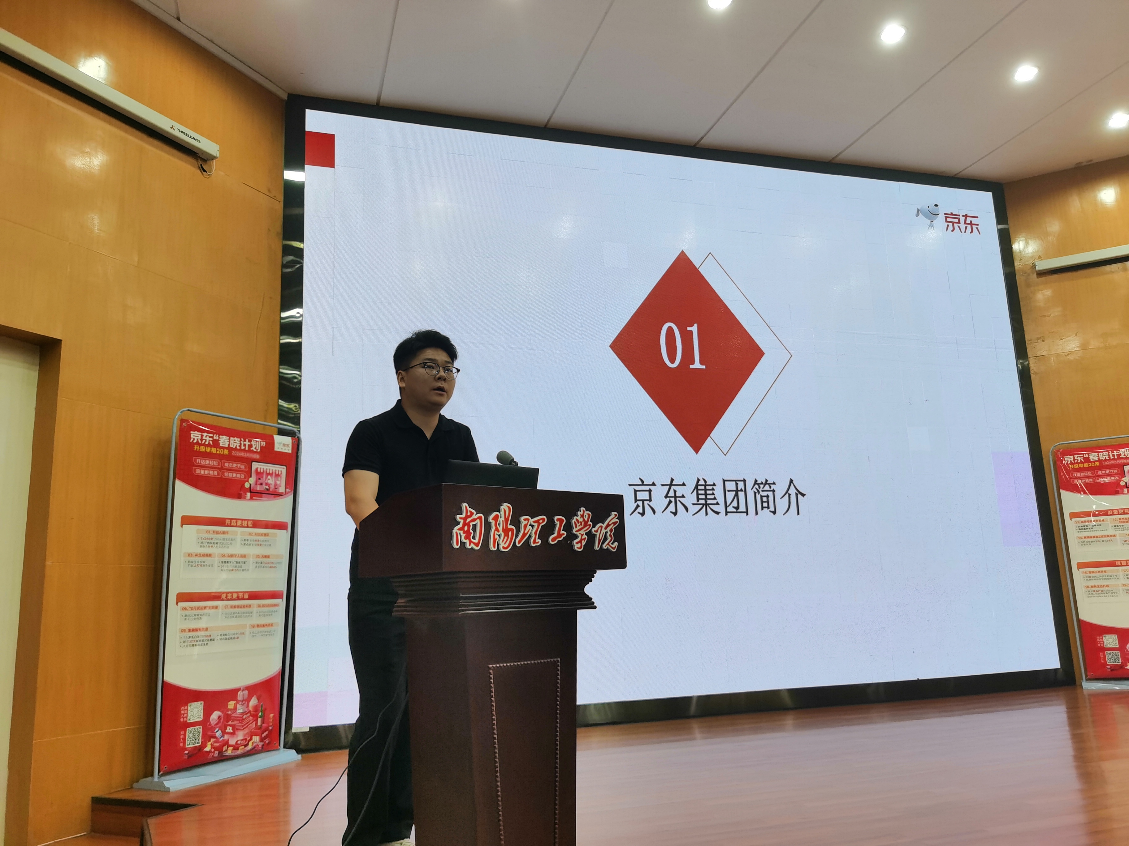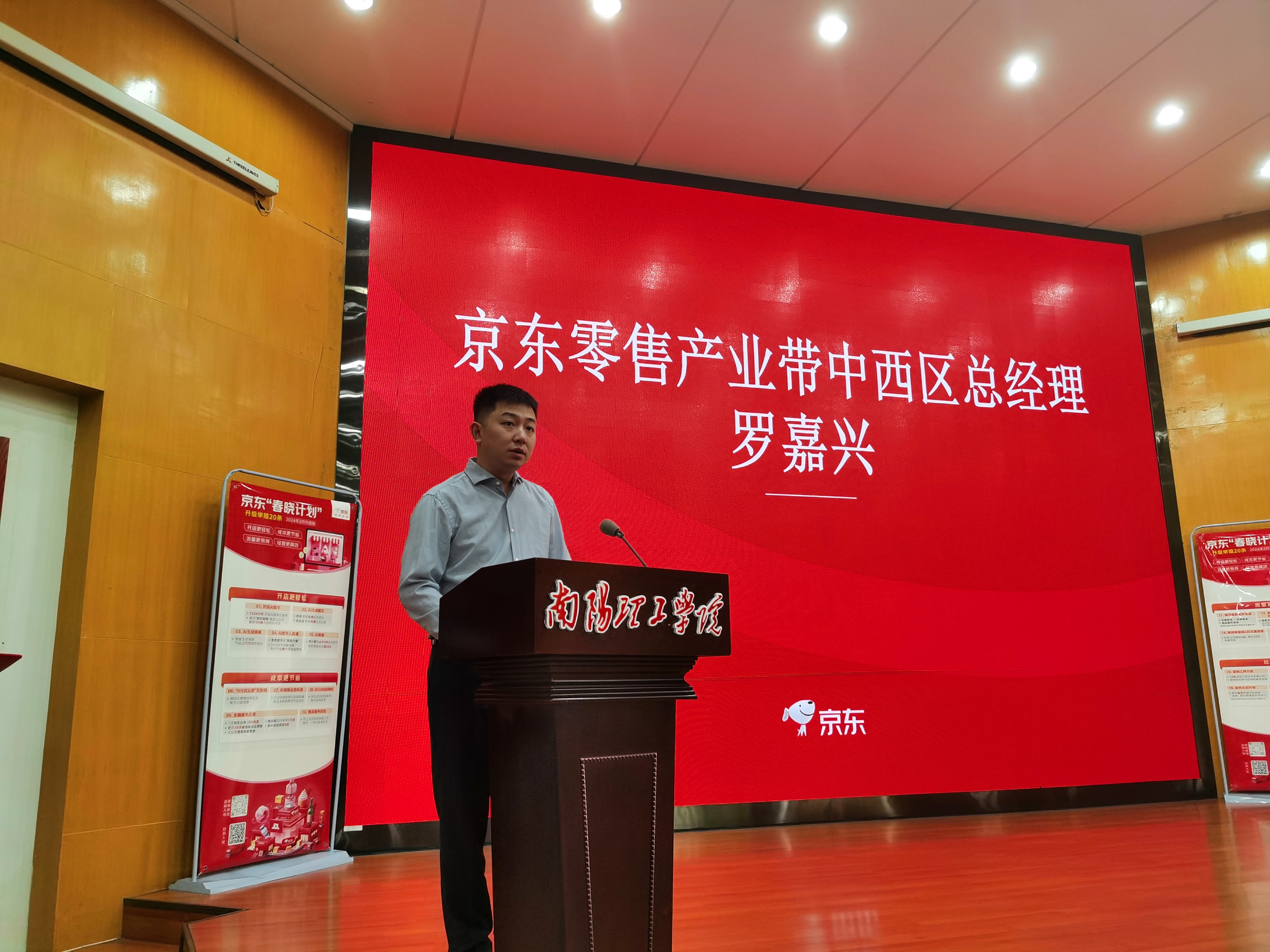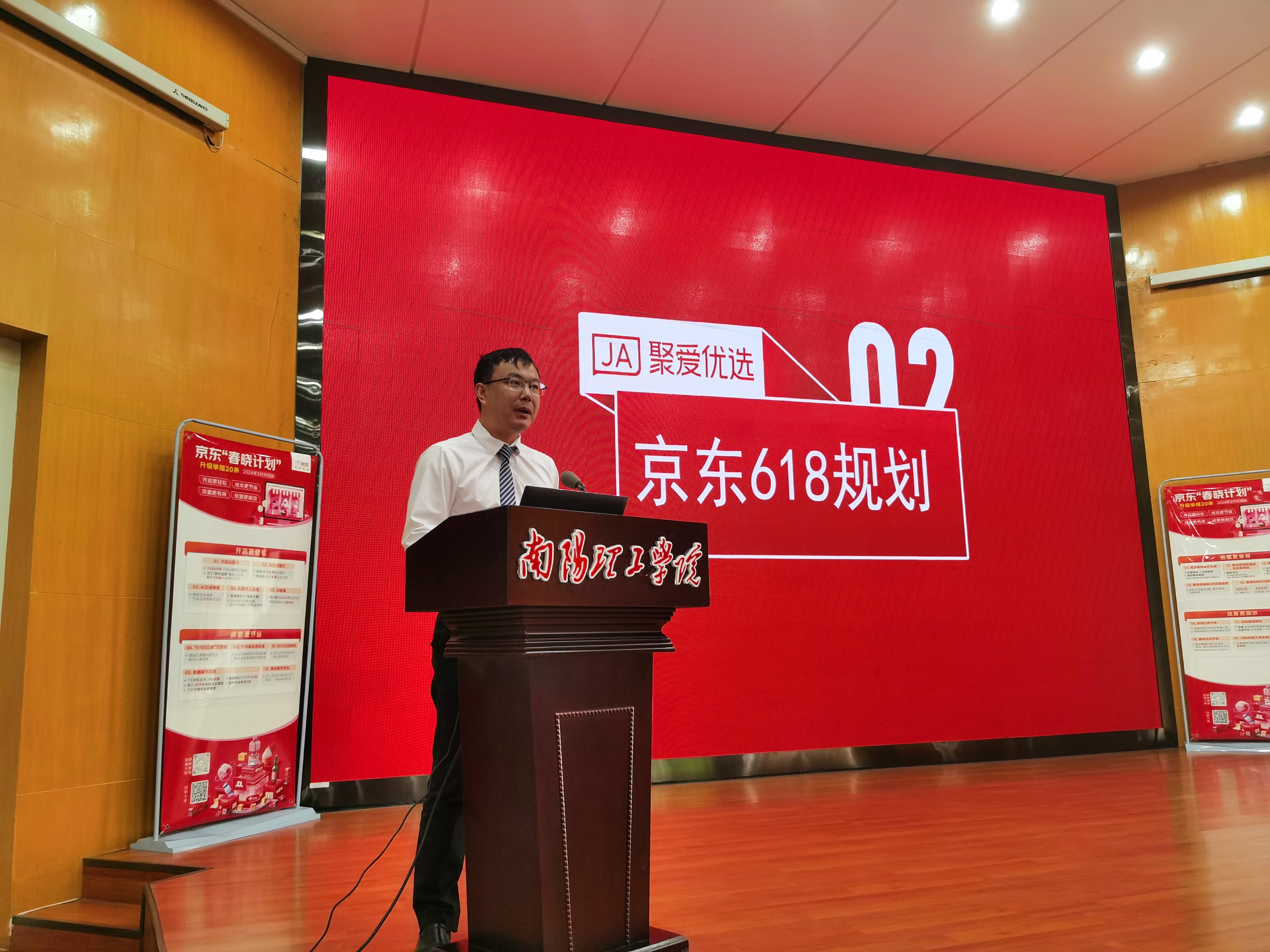 本网讯(特约记者/李浩)5月27日,“京东特色产业带集群中国行·走进南阳暨产业带高质量发展峰会”暨商圣大讲堂第四十一期在我校成功召开。南阳市商务局副局长牛犇、电子商务科科长包阳、电商发展中心主任孙中勋,京东零售产业带中西区总经理罗嘉兴,京东科技(南阳)有限公司总经理王宏喜,京东物流河南省区销售部平台业务负责人王静静,范蠡商学院党委书记闫合占、院长郭永奇、副院长周青浮出席会议,会议由范蠡商学院、南阳理工学院新零售产业学院协办。
