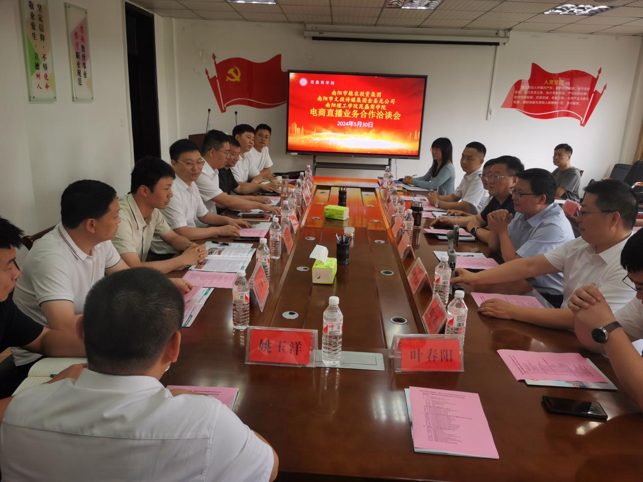 本网讯(特约记者/韩正)5月30日,南阳市粮农投资集团、南阳市文投传媒集团金圣龙公司、南阳理工范蠡商学院电商直播合作洽谈会在范蠡商学院会议室成功举行。南阳市粮农投资集团有限公司副总经理张新迎,南阳市文投传媒集团河南金圣龙文化传播股份有限公司董事长朱建房,范蠡商学院党委书记闫合占、院长郭永奇出席会议,南阳市粮农投资集团有限公司、南阳市文投传媒集团河南金圣龙文化传播股份有限公司相关部门负责人、范蠡商学院社会服务骨干教师等20余人参加了会议。