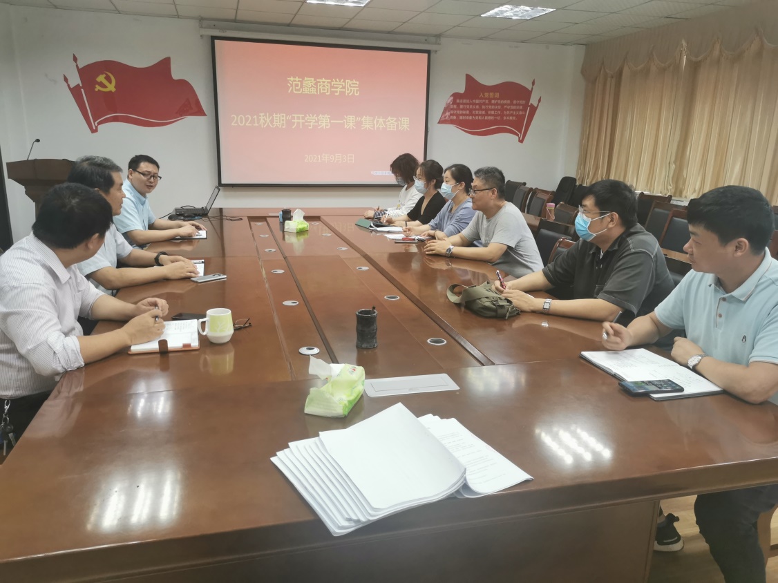 (特约记者/岳莉亚)为了保证“开学第一课”的实效性,切实落实立德树人的根本任务,9月3号下午,范蠡商学院在1号教学楼3楼会议室举行了“开学第一课”集体备课活动。学院党委书记张良、副书记李冬生、副院长郭永奇、教务办主任、各教研室主任参加了集体备课。