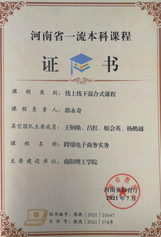 4 | 一流课程 | 跨境电子商务实务 | 省级 | 2021.7 | 郭永奇 |