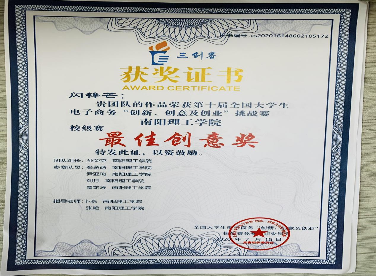 2019.7全国大学生电子商务创新、创意、创业大赛最佳创意奖