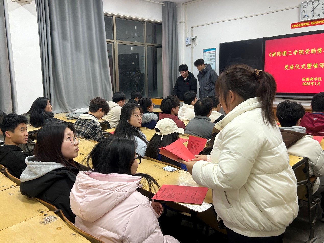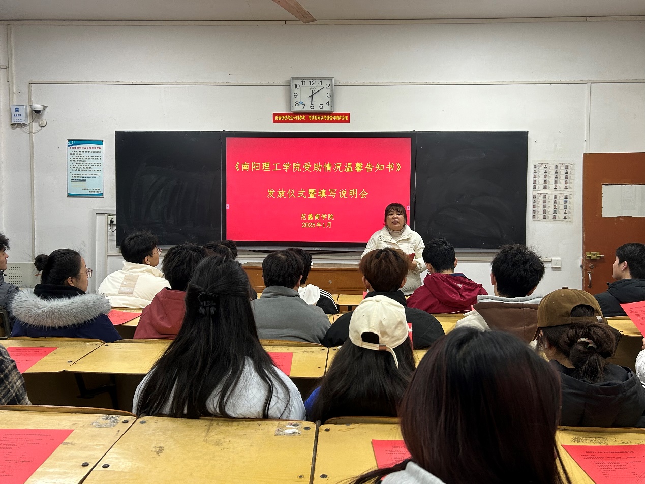 2025年1月6日下午,范蠡商学院根据河南省教育厅及学校工作要求,在一教510教室举行《南阳理工学院家庭经济困难学生受助情况温馨告知书》(以下简称《告知书》)发放仪式暨填写说明会。活动顺利完成2024年国家奖助学金、学校奖学金、单项奖学金、国家助学贷款、参军报国助学金、勤工助学、校内其他资助及社会捐助等项目中受助学生的《告知书》发放工作。