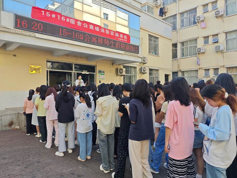 演练开始前,学院提前通过《消防疏散演练注意事项告知书》向全体学生明确了疏散路线、逃生技巧及纪律要求。随着消防警报声响起,疏散演练正式启动。15-16号公寓楼内迅速模拟出浓烟环境,学生在志愿者的引导下,按预案分为东西两路纵队,沿指定楼梯有序撤离。过程中,师生严格遵守“弯腰低姿、湿巾掩鼻”的逃生规范,全员安全抵达集合点,并按楼层列队完成清点。