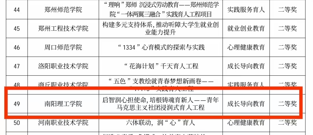 本网讯(特约记者/董博 学生记者/齐颂)近日,河南省教育厅公布了2024年普通高等学校学生工作成果评定结果,我校报送的《启智润心担使命,培根铸魂育新人—青年马克思主义社团浸润式育人工程》项目获评二等奖,充分展示了学校在学生思想引领、素质提升和综合育人方面的突出成效。