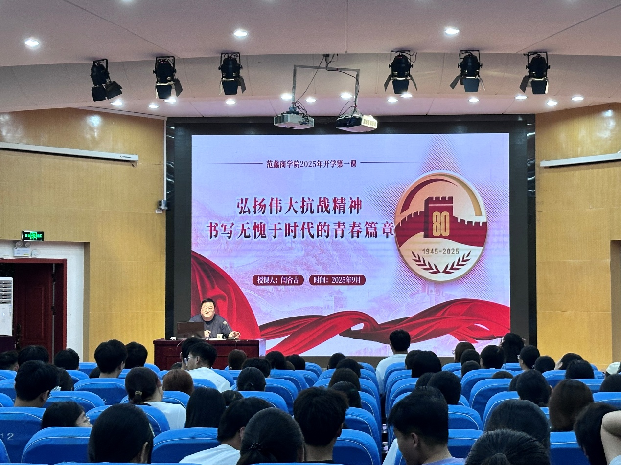 闫合占以《弘扬伟大抗战精神,书写无愧于时代的青春篇章》为题,从厚植家国情怀,坚定理想信念;走进范蠡商学院,厚植专业自信;把握大学节奏,做好生涯规划;坚守规矩底线,守护青春安全;以奋斗姿态迎接青春答卷几个方面,为同学们解释了大学是什么、大学生活的新变化、学院专业设置及人才培养模式等内容。他鼓励同学们要积极适应新环境,全面掌握所学知识,铭记历史,全面提升个人素质,努力成长为新时代堪当强国建设、民族复兴大任的栋梁之才。