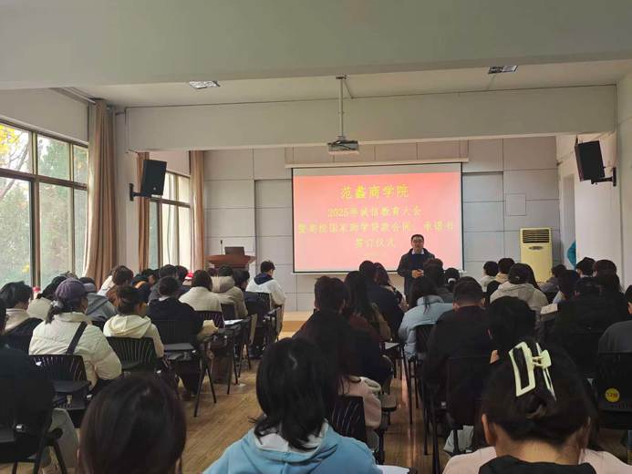 本网讯(通讯员/李莉)贯彻国家高校助学贷款政策,切实帮助家庭经济困难学生顺利完成学业,增强贷款学生的诚信履约意识与感恩责任观念,积极营造“助学·诚信·感恩”的良好校园资助文化氛围,范蠡商学院于11月4日在1号教学楼215教室举行2025年度诚信教育大会暨高校国家助学贷款合同、承诺书签订仪式。学院党委副书记李冬生、资助工作专干张煜梵老师及本年度申请国家助学贷款的学生参加活动。