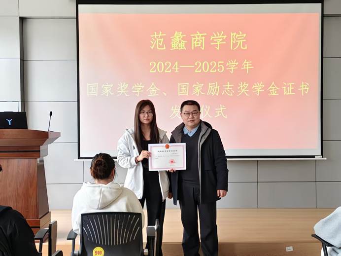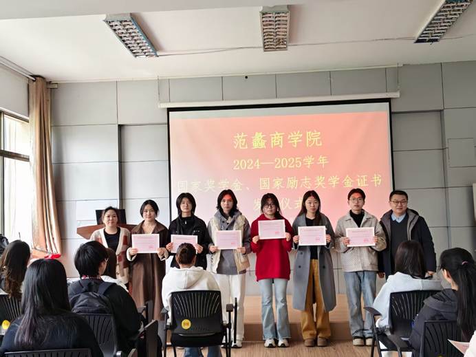 本网讯(通讯员/李莉)为表彰在学业、品德与实践中表现突出的优秀学子,激励广大学生奋勇争先,范蠡商学院于2026年3月25日在1教1215教室隆重举行2024-2025学年国家奖学金、国家励志奖学金证书发放仪式。学院党委副书记李冬生、资助专干张煜梵老师,以及全体获奖学生参加了此次发放仪式。