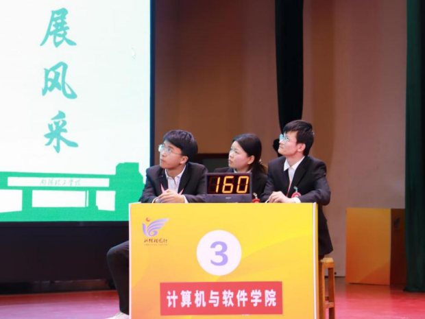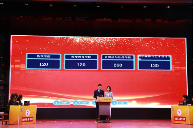 整场比赛精彩纷呈,参赛队员凭借扎实的基础知识和敏锐的思维,沉着应对比赛。在个人必答题环节中,参赛队员自信从容,稳扎稳打。在紧张精彩的抢答环节中,参赛队员紧张有序、配合默契,展示出了不凡的实力。经过激烈的比拼,计算机与软件学院以270分暂列第一,数字媒体与艺术设计学院及数理学院以140分并列第二,教师教育学院以100分暂列第四。大赛本着公平公正的原则进行了新一轮加时赛,最终数字媒体与艺术设计学院顺利晋级总决赛。