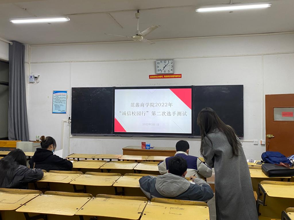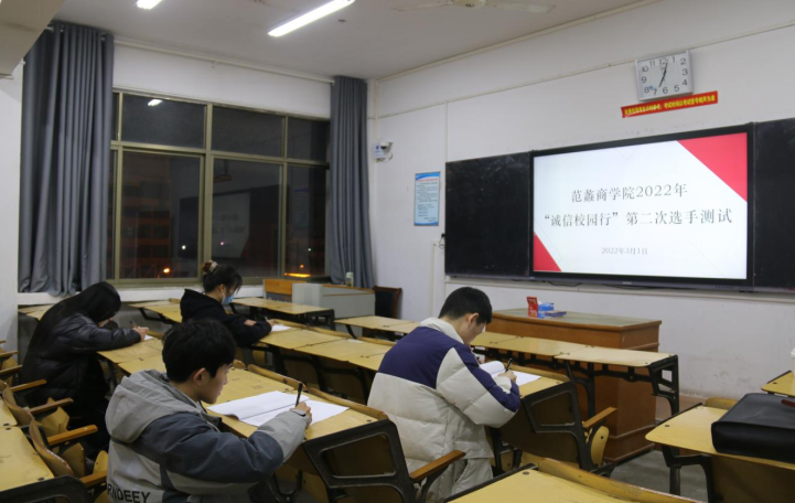 本网讯(通讯员/桑文晓马宇函)为积极宣传学生资助政策,培养大学生的诚信意识,充分展现我院学生明德立信、自立自强、拼搏向上的青春风采。同时,也为今年的“诚信校园行”校决赛和省赛打好基础,做足准备。3月1日晚,范蠡商学院于1529教室举行2022年“诚信校园行”第二轮选手测试。资助专干老师张卓娅监考。