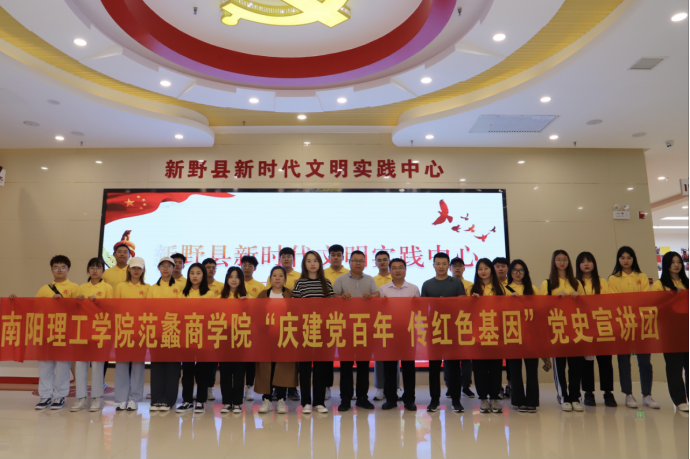 本网讯(通讯员/尤江杰、吕世豪、赵雄)7月5日上午,由南阳理工学院范蠡商学院的22名学生组成的“庆建党百年,传红色基因”百年党史宣讲团,在范蠡商学院党委副书记李冬生、团委书记董博、辅导员张卓娅和张煜梵老师的带领下,一同前往南阳市新野县新时代文明实践中心开展暑期社会实践活动。