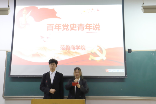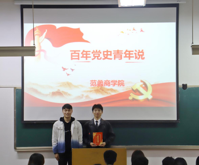 本网讯(通讯员/徐雨萌)为庆祝中国共产党成立100周年,深入学习贯彻党史学习教育动员大会精神。2021年4月6日晚,范蠡商学院于14教306室开展“百年党史青年说”讲党史大赛。20级学生代表参加此次活动。