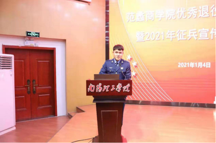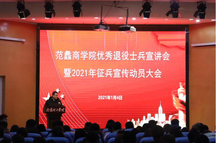 本网讯(通讯员/张慎贵)“参军报国,无上光荣”,为进一步激发同学们的参军报国热情,营造良好的征兵氛围,鼓励更多优秀大学生踊跃参军报国,为我国国防事业贡献青春力量。范蠡商学院于1月4日下午在领创空间报告厅隆重召开优秀退役士兵宣讲会暨2021年征兵宣传动员大会。党委副书记李冬生、团委书记董博、辅导员孙健、张煜梵出席了本次大会。