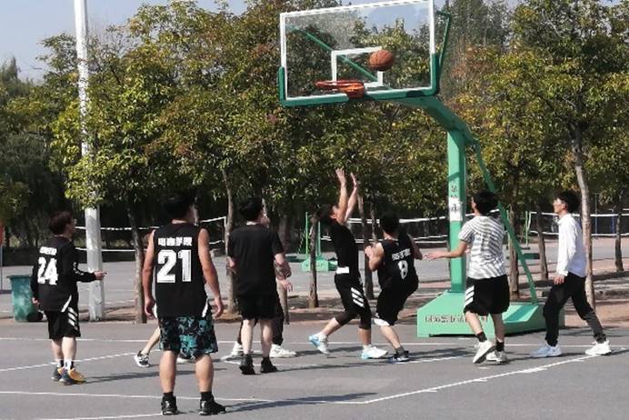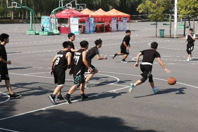 比赛前,各队队员积极进行热身运动并商量战术策略。比赛时,篮球队员快速的传球,精准的投篮赢得同学们的呐喊和欢呼,如潮如海,场上球员们更加意气焕发,酣畅淋漓的挥洒着青春与激情。比分交替上升,僵持不下。
