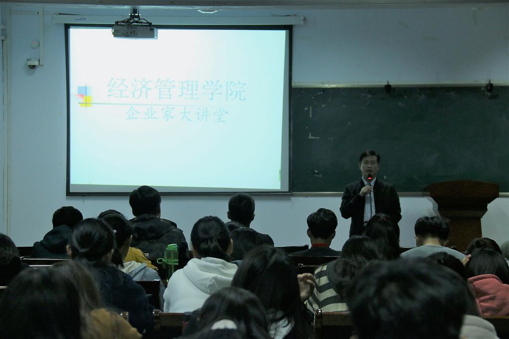 本网讯(通讯员/莫帆)10月18日晚,经济管理学院在9224会议室举办企业家大讲堂。本次讲座特邀邓州市统计局主任、高级统计师冀潜担任主讲嘉宾。经济管理学院向建国老师及近百名同学参与此次讲座。