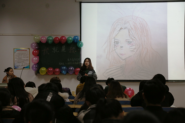 参赛选手借助PPT向在场观众介绍自己的优点和独特之处,并通过自画像展示向观众全面介绍自己。选手们个个都展示出各具特色的自画像,17级国跨班郭思嘉的自画像形象生动,意义非凡,赢得现场观众与评委的一致好评,获得第一名。
