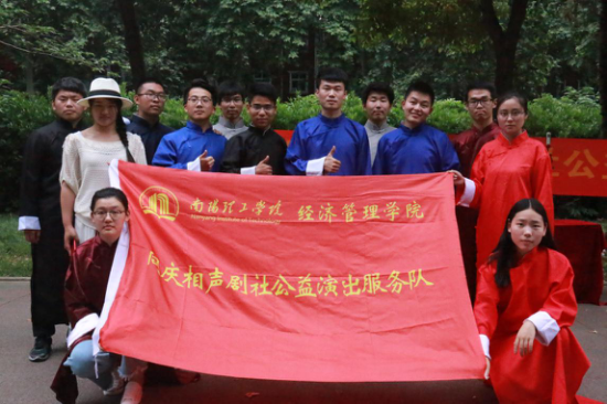 本网讯(学生记者/刘波洋 赵永娜 杨梦勇)为传承和弘扬中华民族优秀传统曲艺文化,响应我校服务地方经济及文化发展的号召,提升我校学生的道德修养、人文素养和智慧潜能。5月21日,经济管理学院同庆相声剧社公益演出服务队在南阳市人民公园如期举行相声表演。现场近300余名南阳市民驻足观看。