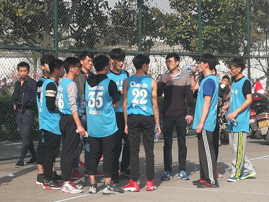 伴随着哨声的响起,现场的气氛极其热烈,双方很快进入激烈的角逐,比分交替上升,僵持不下,上半场结束时电商学院暂时领先于生化学院。休息间隙,李金龙和球队队长胡济邦给球员指导战术。