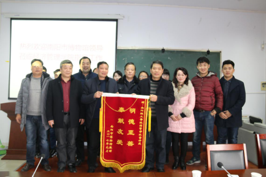 本网讯(特约记者 田进军)2017年1月10日,南阳市博物馆馆长柳玉东、副书记辛明成一行4人来到经济管理学院,亲手将一面写有“明德至善,奉献有爱”的锦旗送到经济管理学院院长姜保雨和党委书记张良的手中,以感谢经济管理学院青年志愿者服务队长期以来为南阳市博物馆工作做出的突出贡献。