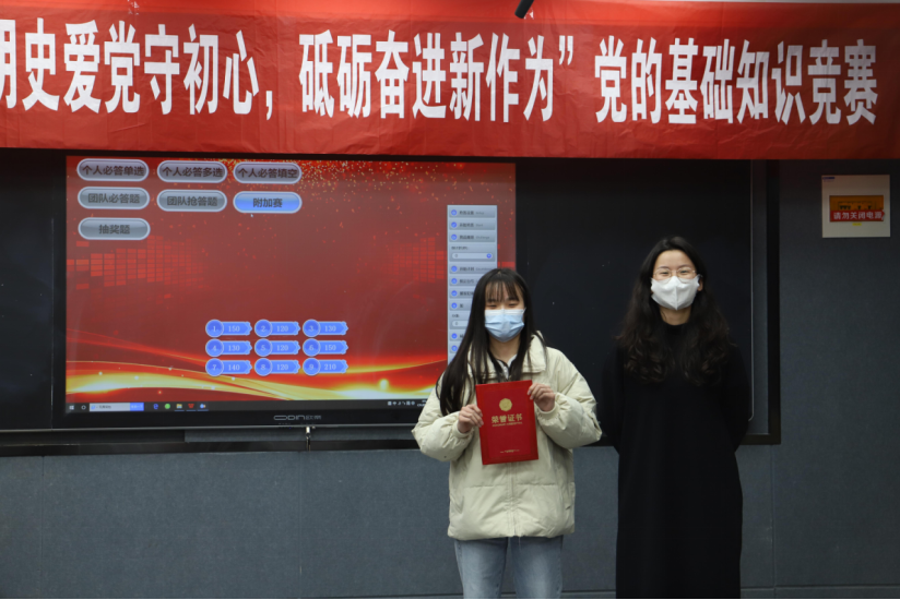 本次知识竞赛以党的二十大精神和党史知识为主,通过必答题、抢答题、填空题等题型,全方位考查选手们对党的二十大报告、党章党史等内容的学习成果。活动现场选手们沉着冷静,团队分工明确,思路清晰,激烈的抢答更是将比赛的气氛推向了高潮。本次比赛获得一等奖的是陈皙、刘倩琳、高盼婷,获得二等奖的是汪聪慧、杨路想、张慧、贾潇、霍艳青、马静怡,获得三等奖的是朱梦佳、王鑫雨、刘子媛、任金磊、崔思伟、何姝杭,文志、郑思芃、李世豪。