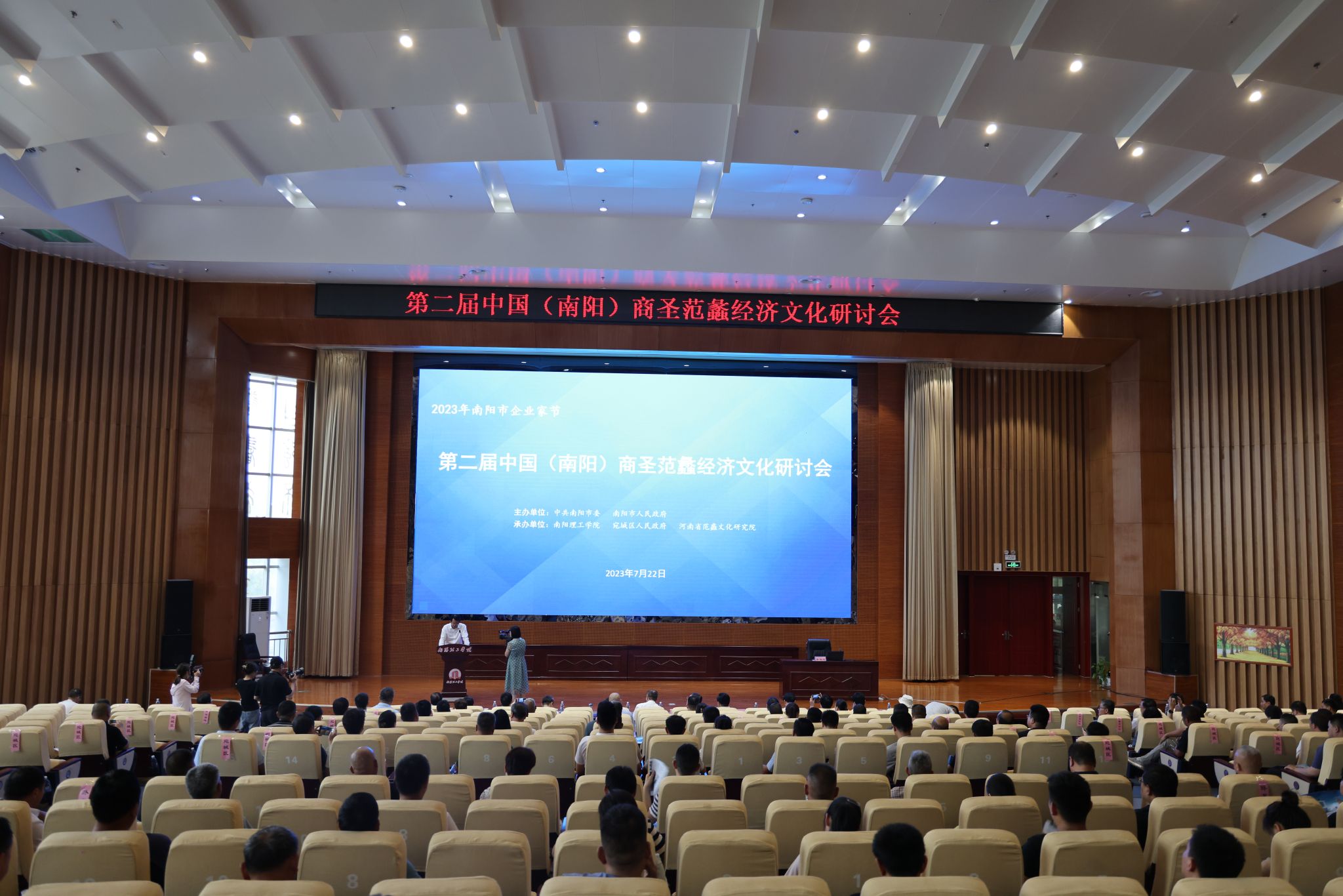 本网讯(特约记者/李浩)7月22日,由南阳理工学院承办的第二届中国(南阳)商圣范蠡经济文化研讨会在我校第三报告厅成功举行。 南阳市人民政府副市长杨曙光主持会议,河南省企业联合会、河南省企业家协会常务副会长、秘书长郜永军,南阳市人民政府副秘书长葛斌,南阳理工学院校长安士伟,中共南阳市宛城区委书记、区长樊牛出席会议并讲话。北京大学经济学院经济史学系主任、教授、博士生导师周建波,苏州市范蠡文化研究会会长、范蠡文化研究(中国)联会秘书长周文生,《中国企业报》集团企业文化研究院院长、北京伟业智胜智库董事长王唯,南阳理工学院教授、范蠡商业思想研究中心主任范荣华,南阳市坤奥集团公司董事长、河南省范蠡文化研究院副院长、秘书长范险峰等专家做了主题报告。