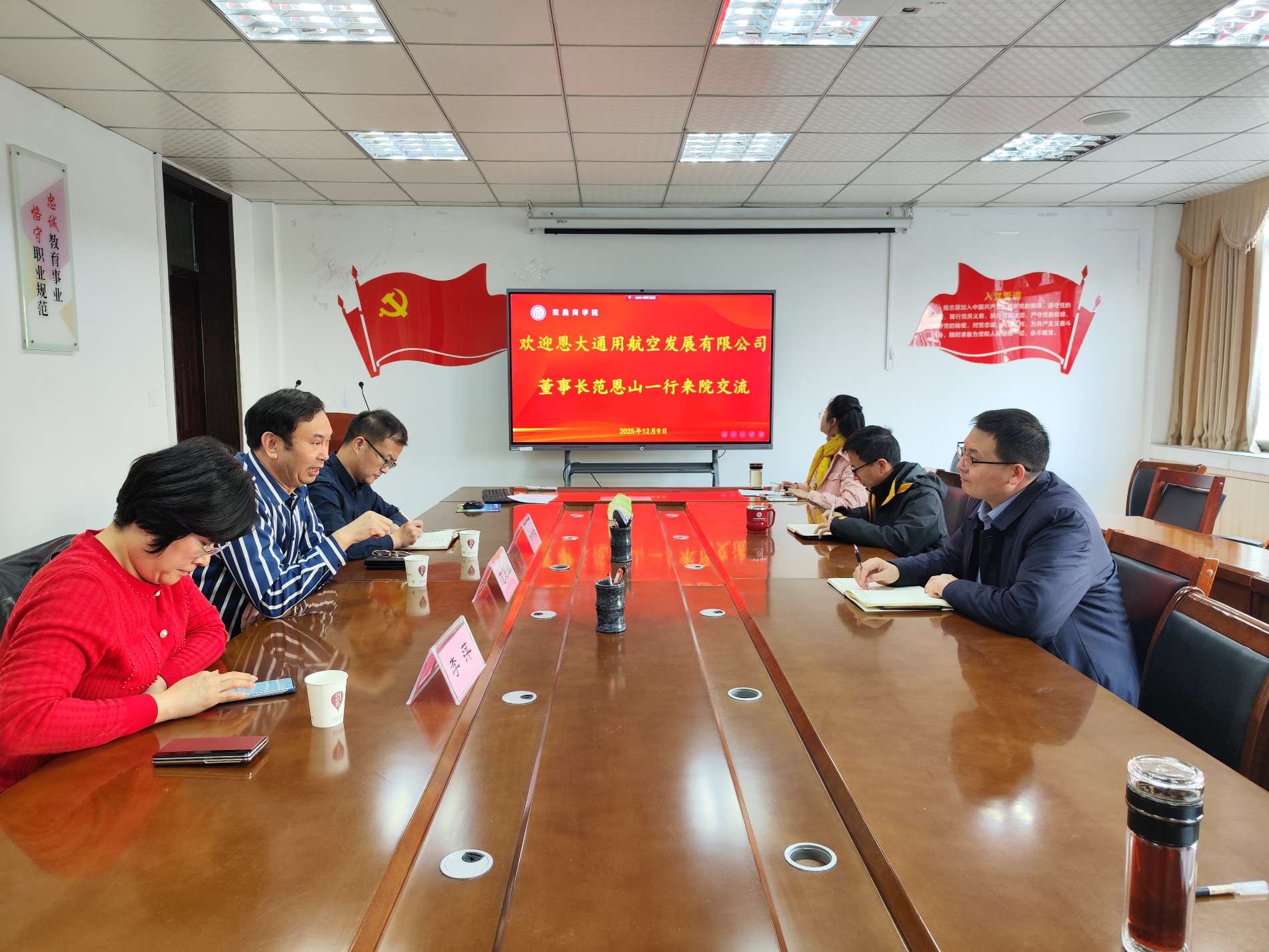 本网讯(特约记者/刘新飞)12月9日,恩大通用航空发展有限公司董事长范恩山、总经理吴新超一行莅临我院,范蠡商学院院长郭永奇、副院长周青浮及部分骨干教师参加座谈会,双方围绕低空经济人才培养、产业研究院建设等核心议题深入交流。