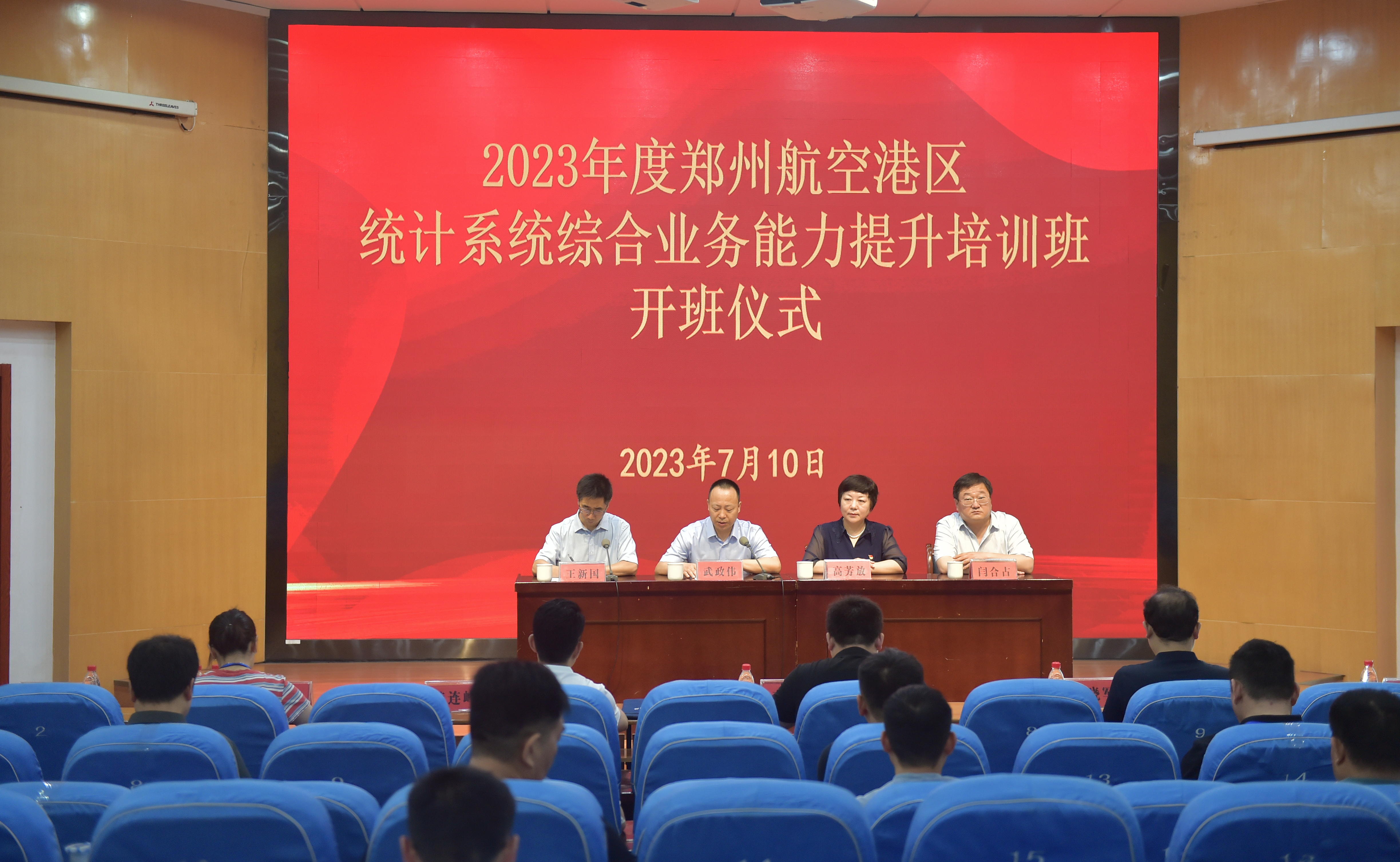 本网讯(特约记者/李浩)7月10日,由范蠡商学院主办继续教育学院协办的为期一周的“2023年度郑州航空港区统计系统综合业务能力提升培训班”在中关村报告厅隆重举行开班仪式。我校副校长高芳放,范蠡商学院党委书记闫合占,郑州航空港经济综合实验区经济发展局(统计局)副局长武政伟、负责人王新国出席开班仪式。郑州航空港区统计系统业务人员60余人,范蠡商学院相关负责人出席了活动。