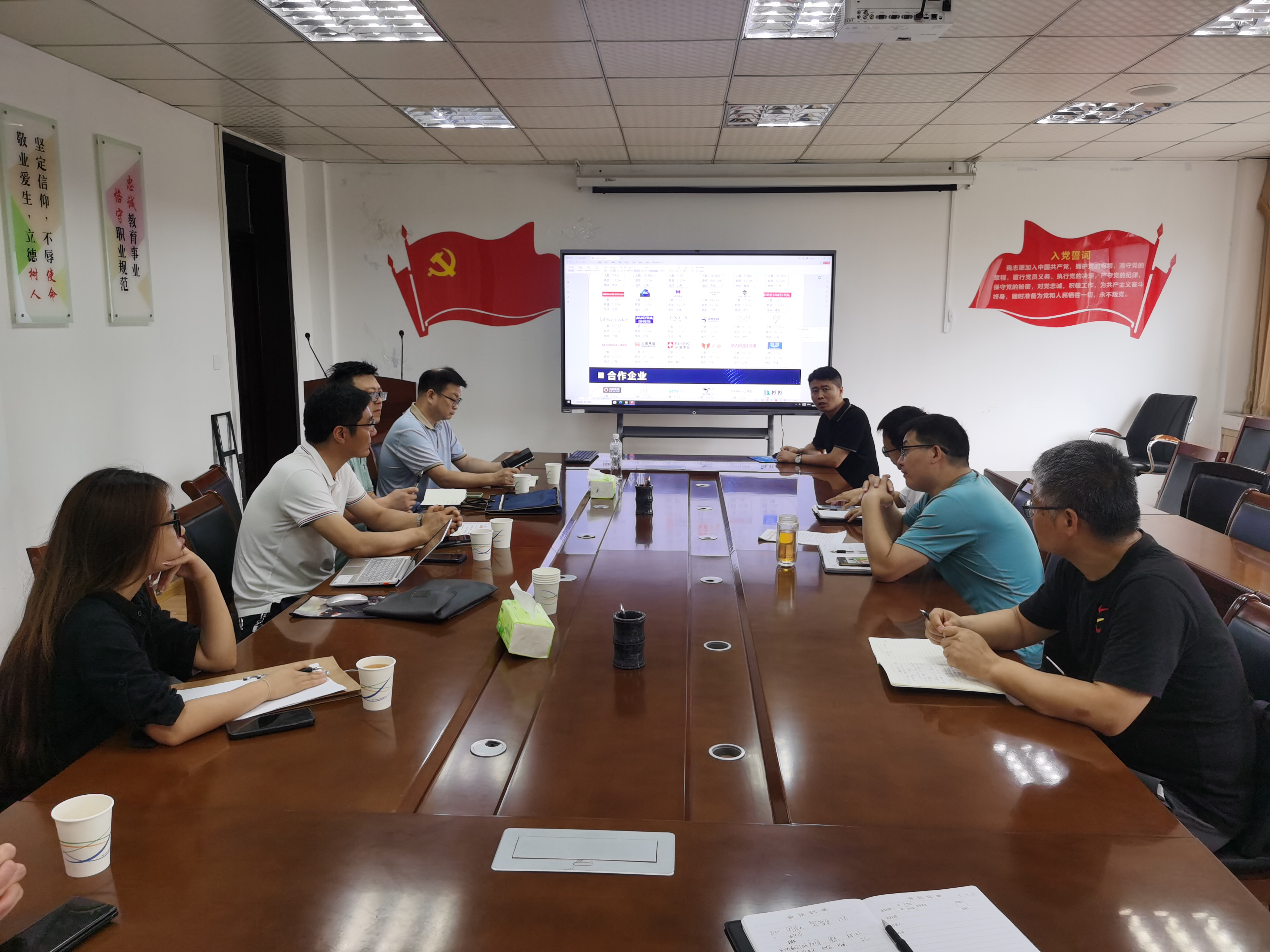 本网讯(特约记者/李浩)7月19日,范蠡商学院召开多方校企合作洽谈会。仲景街道办事处招商主任梁贺峰,京东(南阳)数字经济产业园招商经理徐润芳,京东企业运营服务商程申华,南阳市生态文明促进会副秘书长、南阳市乡村振兴研究院数字乡村发展中心主任姚全军,南阳市宛新生态服务有限公司总经理韦斌、副总经理王祥出席会议,范蠡商学院院长郭永奇、副院长周青浮及相关部门负责人参加会议。