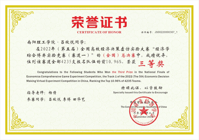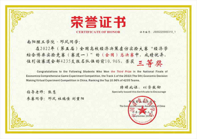 本网讯(通讯员/郭长岳)2022年9月,由中国商业经济学会主办,深圳北理莫斯科大学承办的2022年第五届全国高校经济决策虚拟仿真实验大赛落下帷幕,我院学生组队参加并喜获佳绩。