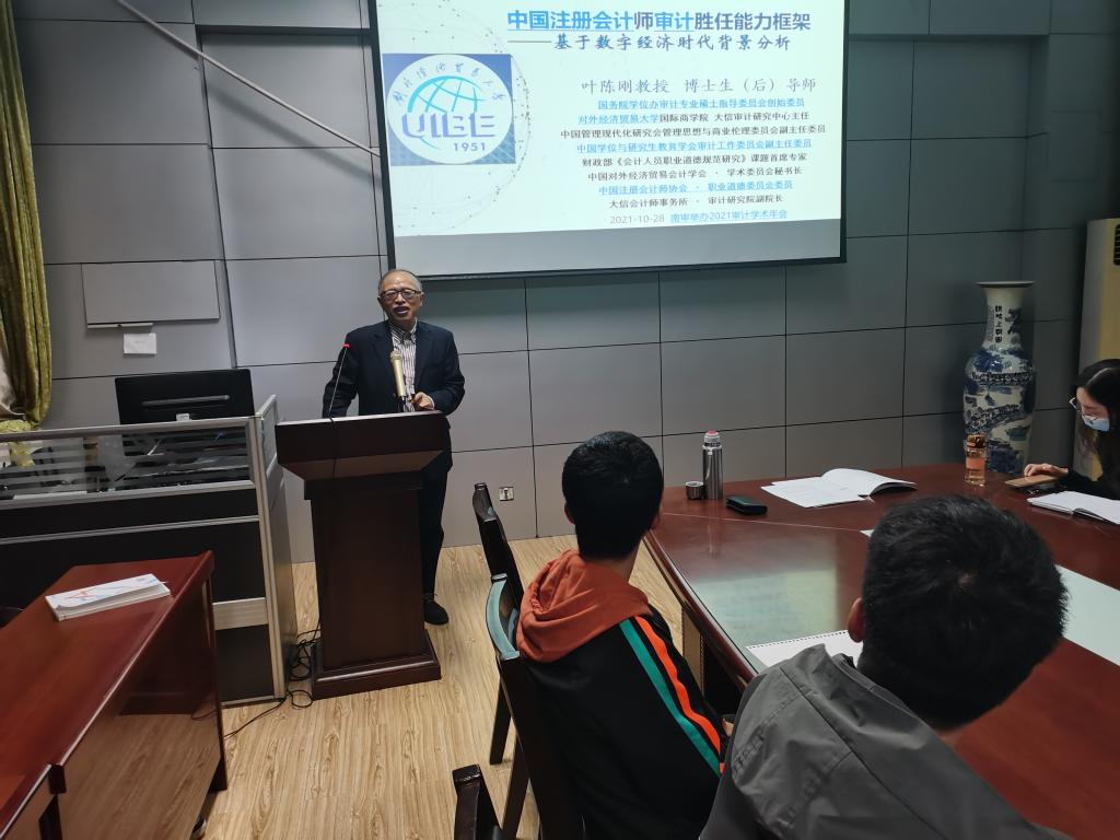 叶陈刚做了主题为《中国注册会计师审计胜任能力框架——基于数字经济时代背景分析》的学术报告,首先结合政策分析了强调了审计工作的重要性,接着从选题过程与研究背景、研究方法与研究框架、主要内容与研究结论、自我评价与前景展望等方面结合自己研究成果进行了深入浅出的阐述,期间与参会师生进行了深入的互动。