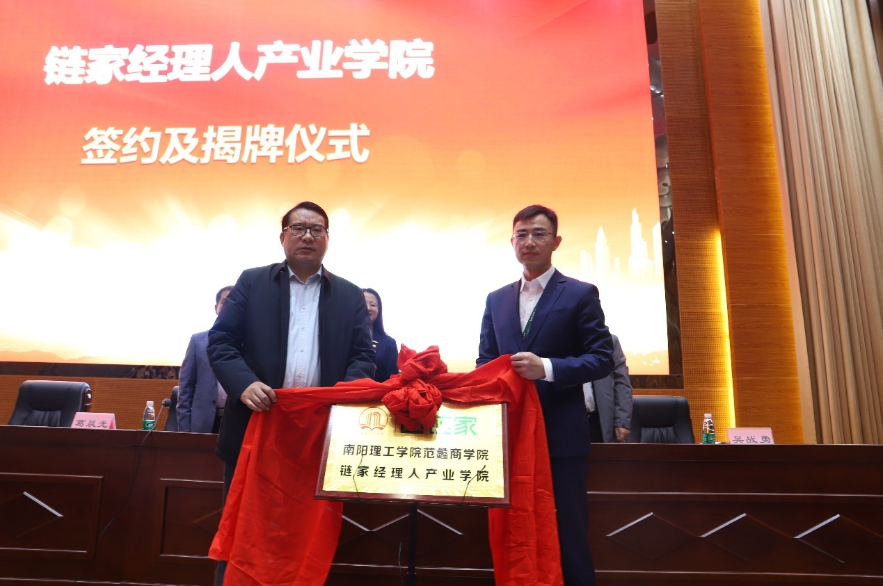 在报告会上,南阳理工学院副校长葛晨光教授与上海链家房地产经纪有限公司运营总经理曹艳清为“链家经理人学院”揭牌。