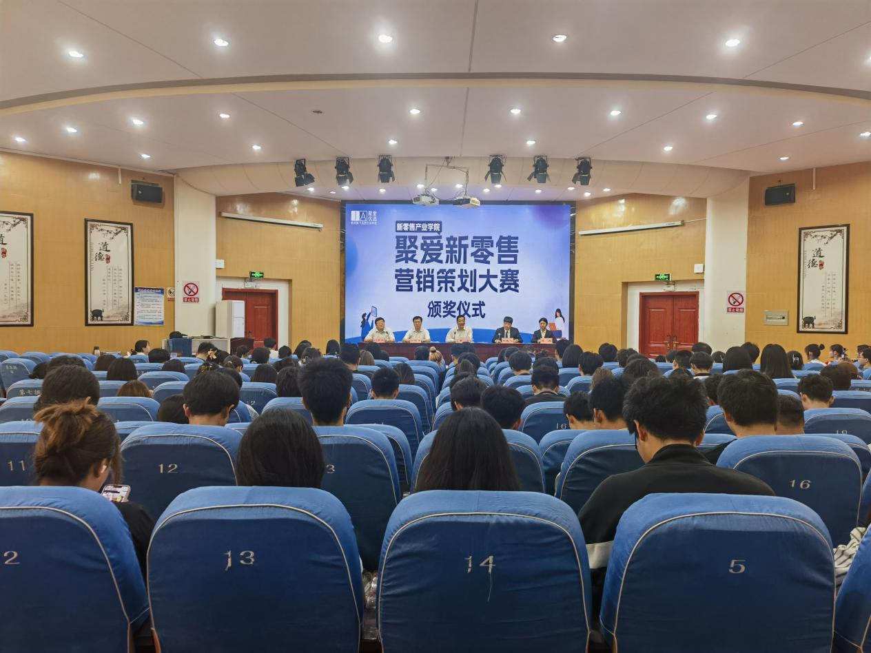 闫合占宣读《关于表彰“聚爱新零售”营销策划大赛获奖同学的决定》。学校和企业领导共同为获得一、二、三等奖、优秀奖、创新创意奖的20支队伍代表颁奖。