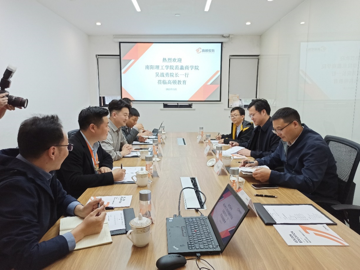 第五站是高顿教育上海总部,高顿教育是一家以财经教育为核心,集教育培训、教育服务、教育科技与产品研发于一体的综合性国际职业教育集团,创立至今已在全国近60座城市开设了超150家分支机构,并在英国、澳大利亚等国家和地区设立了分校,拥有近万名全职员工。吴战勇介绍了学院产教融合、人才培养、科研创新等方面取得的办学成绩。高顿教育产教融合中心总经理柯宇介绍了高顿产业学院合作方案以及国内兄弟院校成功案例,高顿产教融合中心架构师陈敬星介绍了智能会计建设方案及课程设置,双方就毕业生就业工作形成了多项共识。