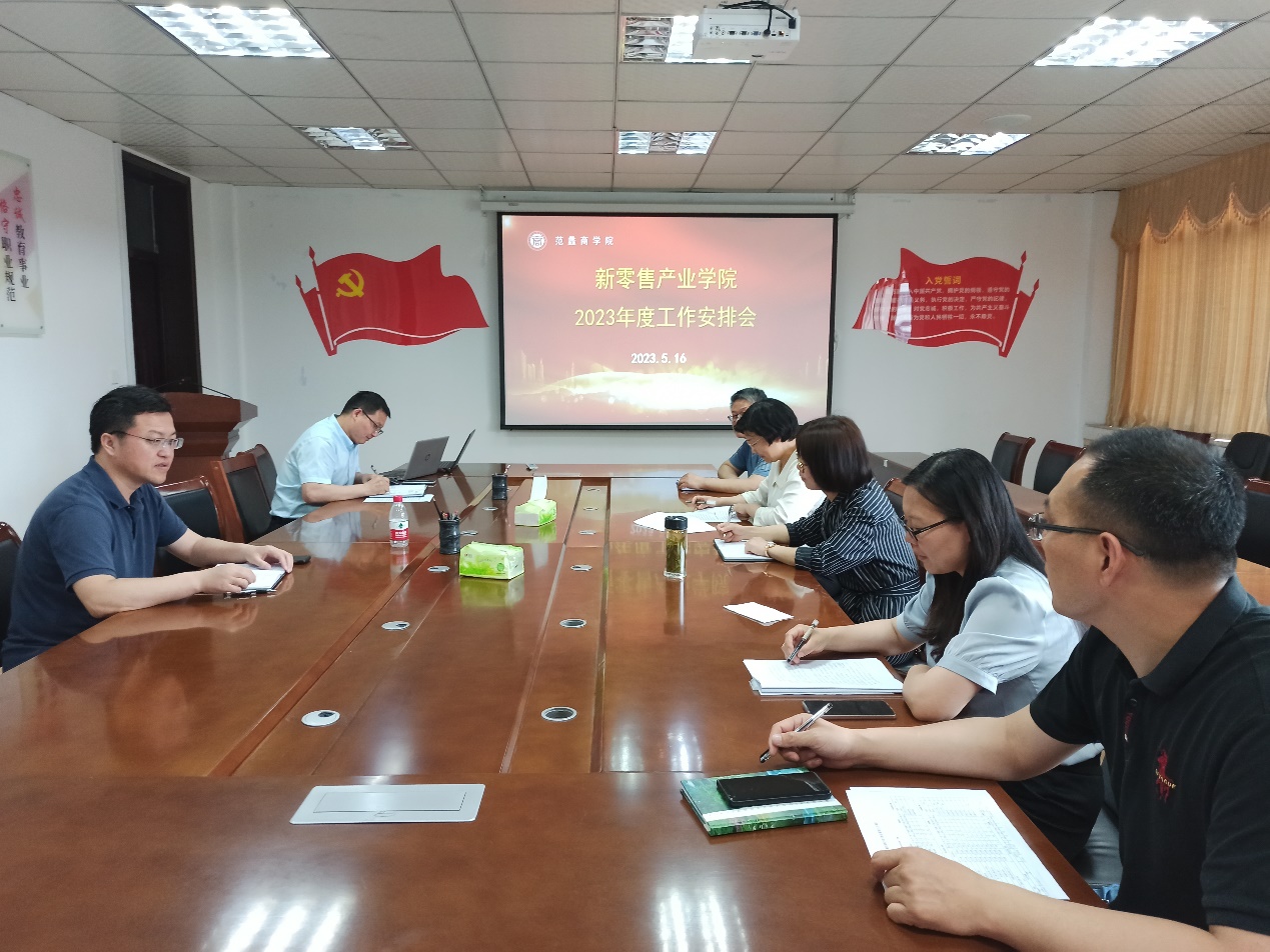 5月16日下午,范蠡商学院在1号教学楼1331会议室召开新零售产业学院2023年度工作安排会,部署2023新零售产业学院具体工作。院长吴战勇出席会议,副院长郭永奇主持会议,新零售产业学院相关教师参加。