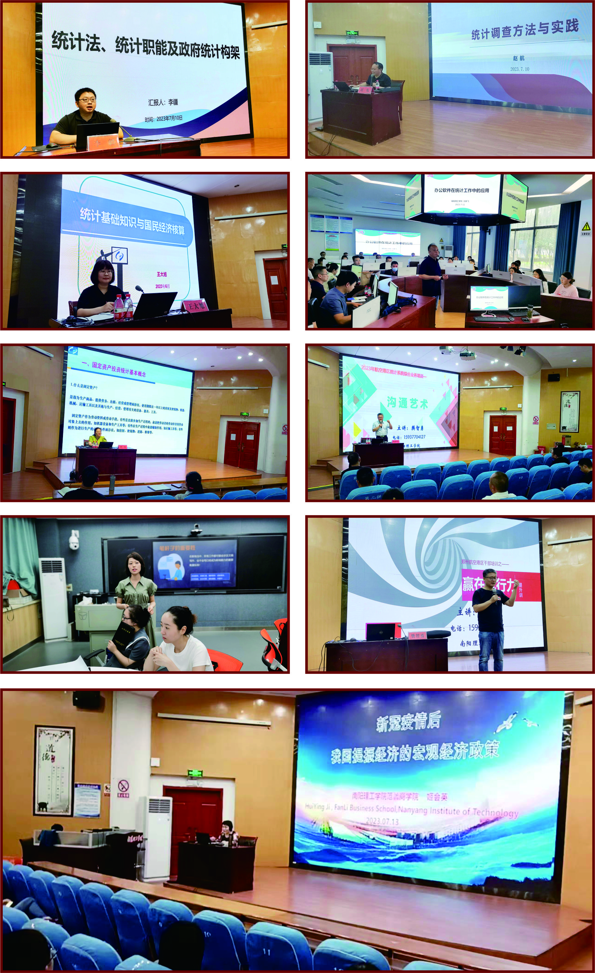 本次培训,业界专家郑州市统计局设管处处长李疆,张衡科技文化园书记、主任高级统计师王大旭,卧龙区统计局统计师梁爽分别作了主题为《统计法、统计职能及政府统计构架》《统计基础知识与国民经济核算》《固定资产投资统计工作》的专题培训,校内专家范蠡商学院骨干教师赵航、刘新飞、樊智勇、姬会英、李玉分别作了主题为《统计调查方法与实践》《办公软件在统计工作中的应用》《沟通艺术》《赢在执行力》《公文写作》《新冠疫情后我国提振经济的宏观经济政策》的专题培训。
