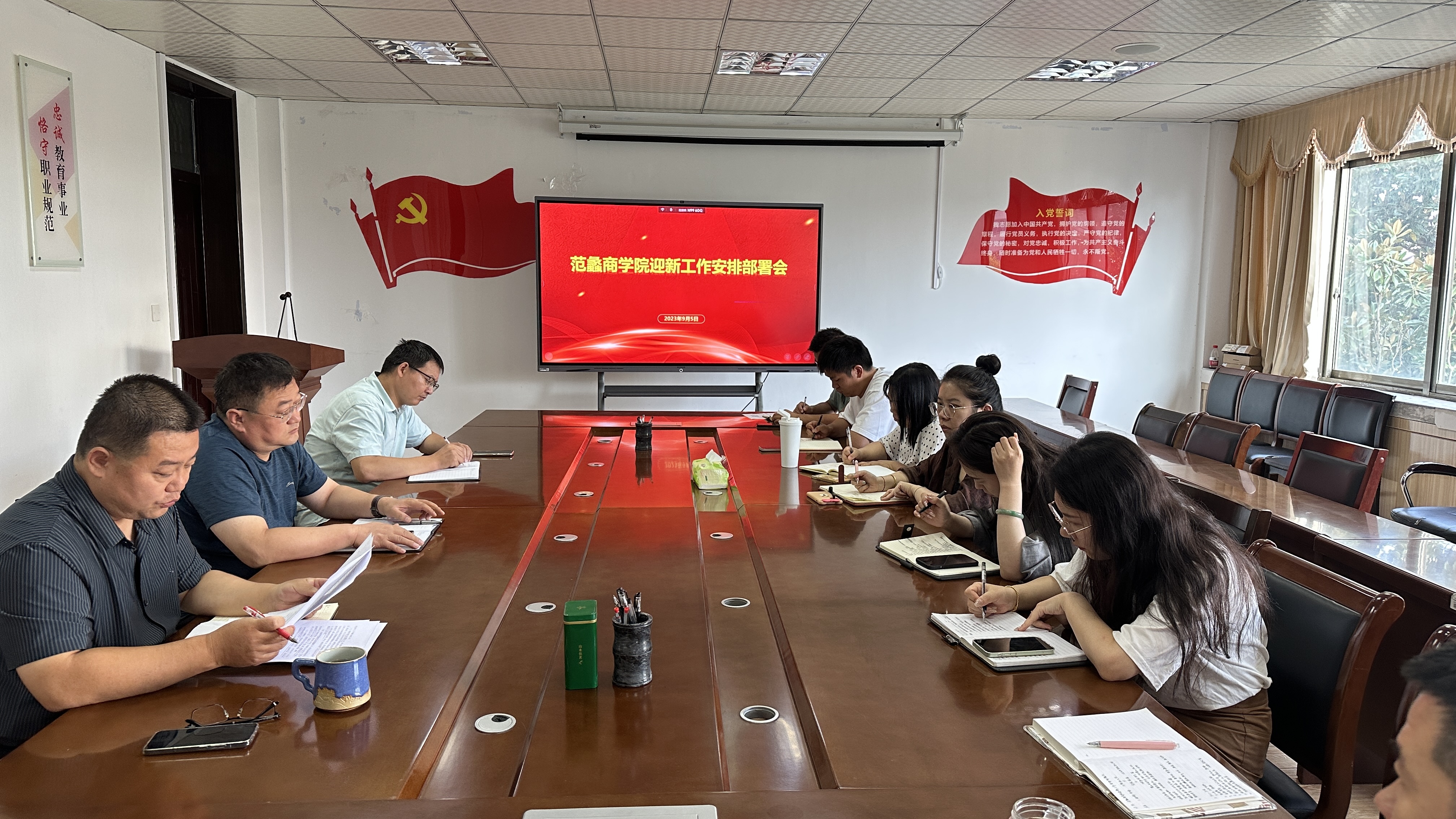 本网讯(特约记者/王健平)为加强对2023年新生迎新工作的组织与协调,确保新生报到、开学典礼、入学教育、军训等各项工作安全有序进行,9月5日上午,范蠡商学院于1331会议室召开迎新工作安排部署会。会议由学院党委副书记李冬生主持,学院党委书记闫合占、副院长郭永奇及全体学工队伍参加会议。