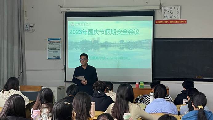 本网讯(通讯员/杨景莉)中秋节、国庆节双节假期将至,为进一步提高师生安全意识,牢固树立安全观念。9月26日至27日,范蠡商学院举行全体教职工安全教育大会,学院党委书记闫合占围绕网络意识形态及网络舆情、交通出行、学生安全等方面进行了部署,会后党政办公室深入各科室进行检查督导,各年级学生开展了“喜迎国庆,安全同行”安全教育主题班会,辅导员深入班级对全体学生进行了安全教育。