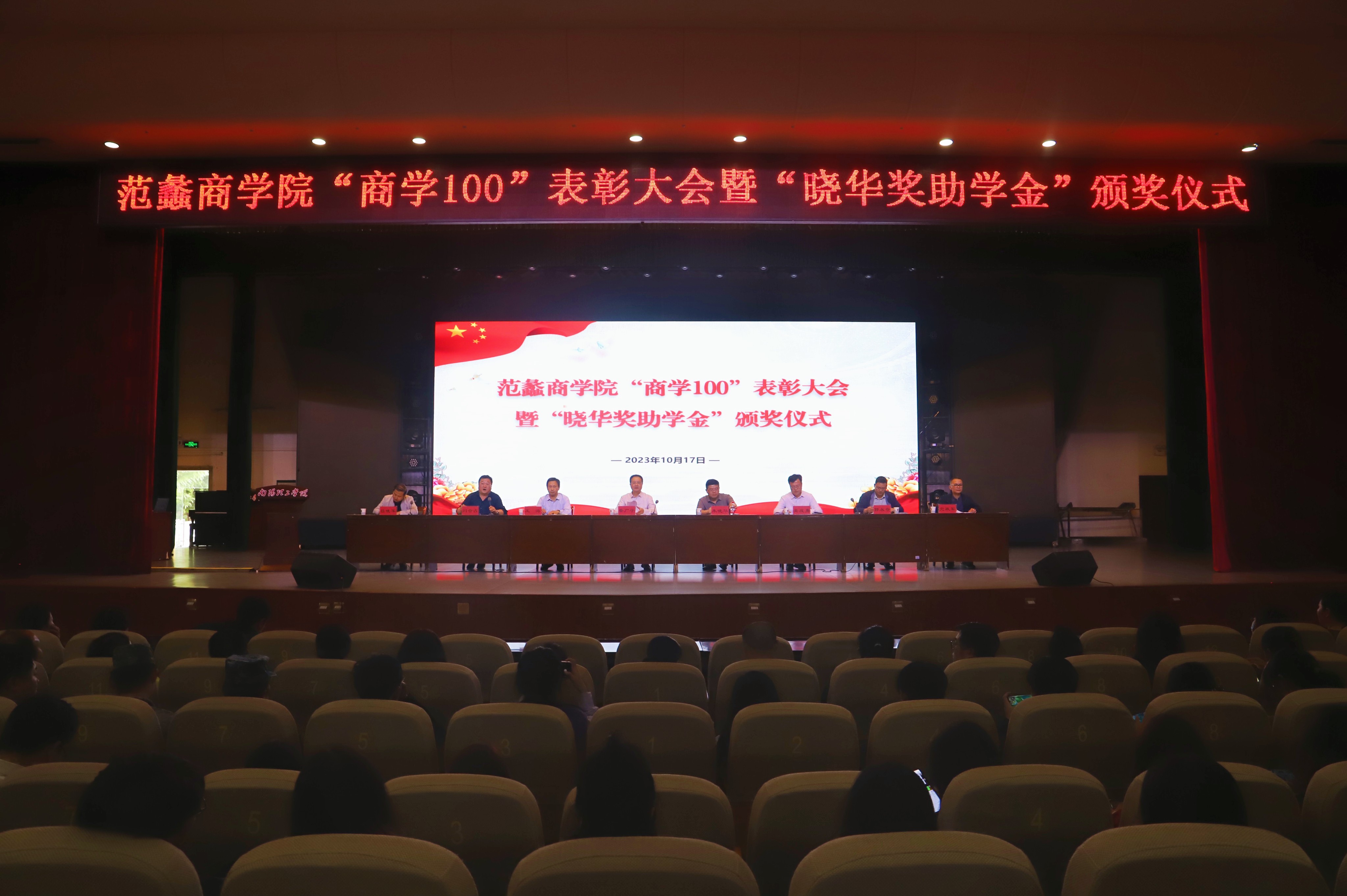 本网讯(特约记者/韩正)2023年10月17日,范蠡商学院“商学100”表彰大会暨“晓华奖助学金”颁奖仪式在毕业大厅隆重举行。副校长蔡广宇、教育发展基金管理办公室相关负责人、晓华奖助学金创办人朱晓华、范蠡商学院领导班子出席本次会议,范蠡商学院全体教师和学生代表参加会议。