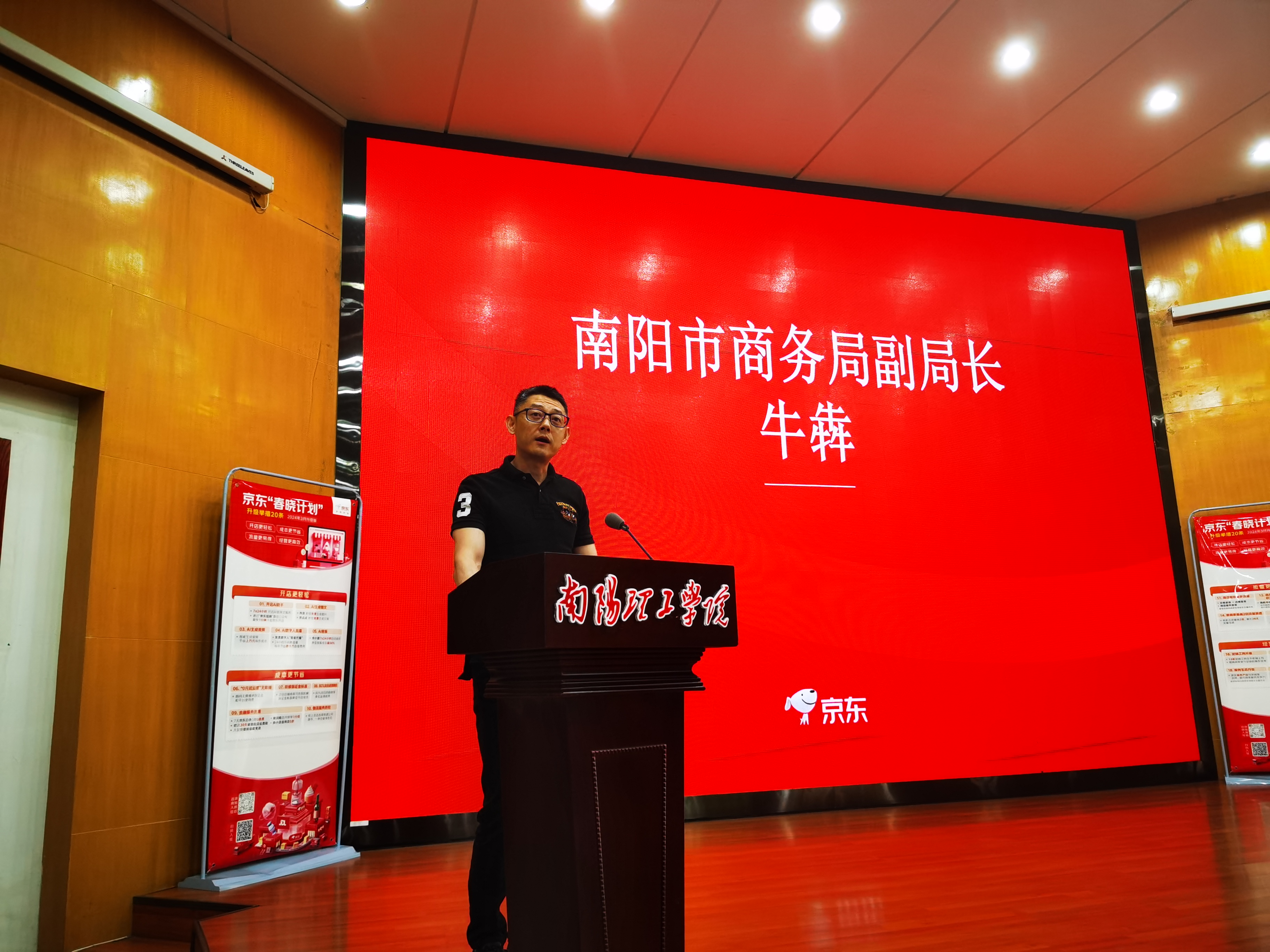 本网讯(特约记者/李浩)5月27日,“京东特色产业带集群中国行·走进南阳暨产业带高质量发展峰会”暨商圣大讲堂第四十一期在我校成功召开。南阳市商务局副局长牛犇、电子商务科科长包阳、电商发展中心主任孙中勋,京东零售产业带中西区总经理罗嘉兴,京东科技(南阳)有限公司总经理王宏喜,京东物流河南省区销售部平台业务负责人王静静,范蠡商学院党委书记闫合占、院长郭永奇、副院长周青浮出席会议,会议由范蠡商学院、南阳理工学院新零售产业学院协办。