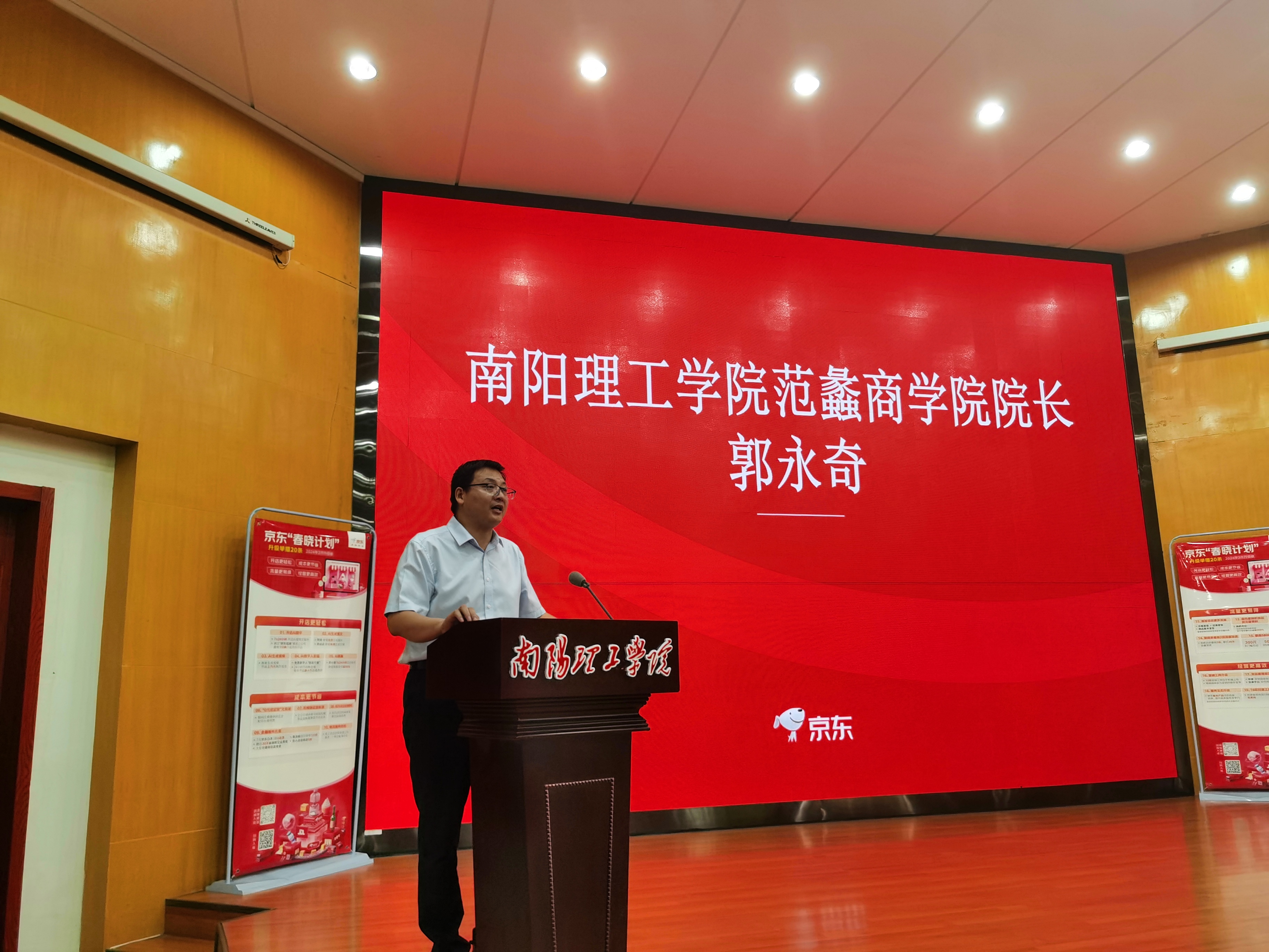 郭永奇介绍了范蠡商学院发展概况,指出学院始终以传承和弘扬范蠡商业思想为己任,鼓励和支持广大教师立足学校、创业南阳、服务河南,学院将立足实际,突出特色,以提高教育教学质量为中心,不断探索政-校-企合作新模式。学院持续创新开放的、可持续发展的校地校企深度合作的工作机制,提升学科专业建设水平和增强服务地方社会经济发展的能力。学院在服务地方社会经济成效显著,在南阳市产业发展尤其是电子商务产业发展中具有一定的话语权和影响力,学院为把学校建设成高水平的应用型理工大学做出积极贡献。南阳市商务局、京东集团、南阳电商企业与范蠡商学院有着传统友好深入的合作关系,希望一如既往支持范蠡商学院的事业发展和共同服务南阳社会经济发展。