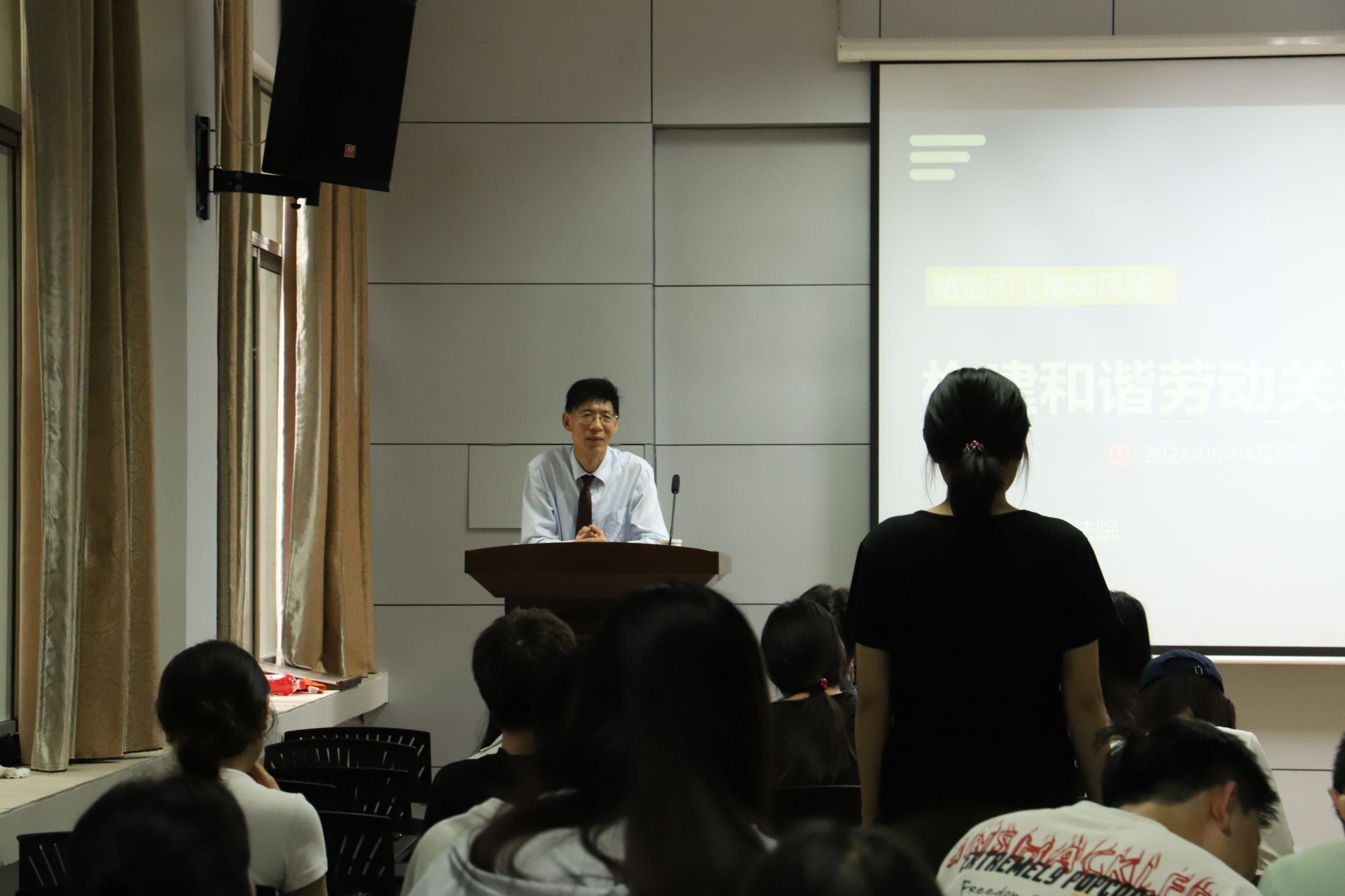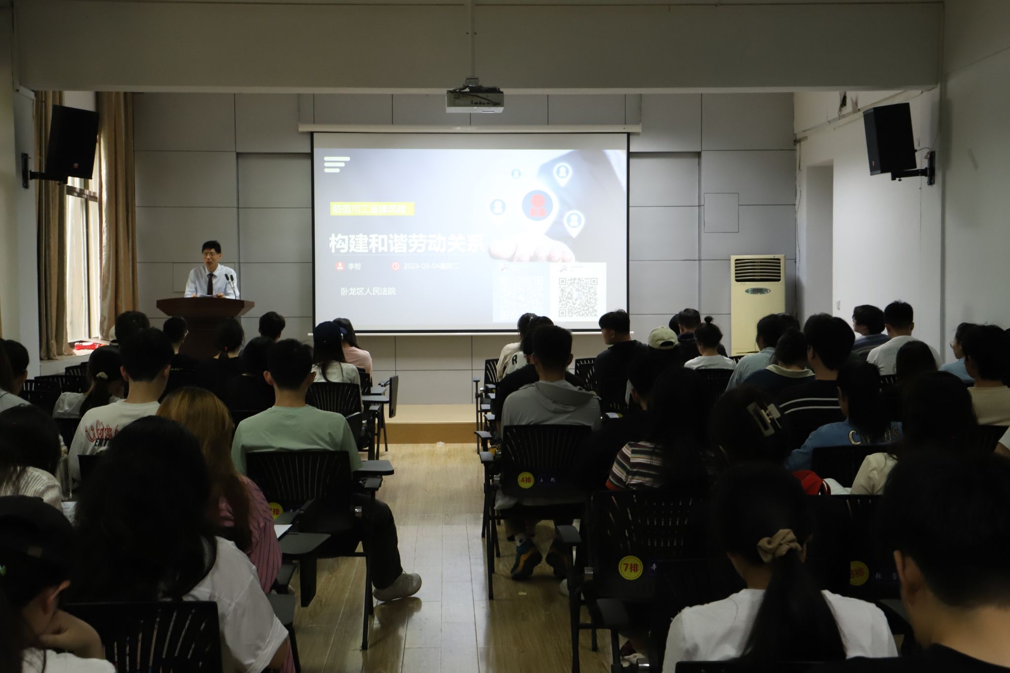 本网讯(特约记者/马春元)又是一年毕业季,众多高校毕业生即将告别校园,走入职场。为了引导毕业生树立正确的就业观、职场观,识别、规避劳动合同签订、履行过程中的潜在风险,切实护航毕业生的求职路,2024年6月4日下午,卧龙区法院的李哲法官应邀来到我校,将劳动争议审判实务案例数据信息带入高校课堂,讲解劳动争议常见情形及对策建议,回答学生兼职、求职、实习、就业中遇到的问题,为范蠡商学院学生植入劳动合同法特制“芯片“,助力毕业届学生顺利远航。
