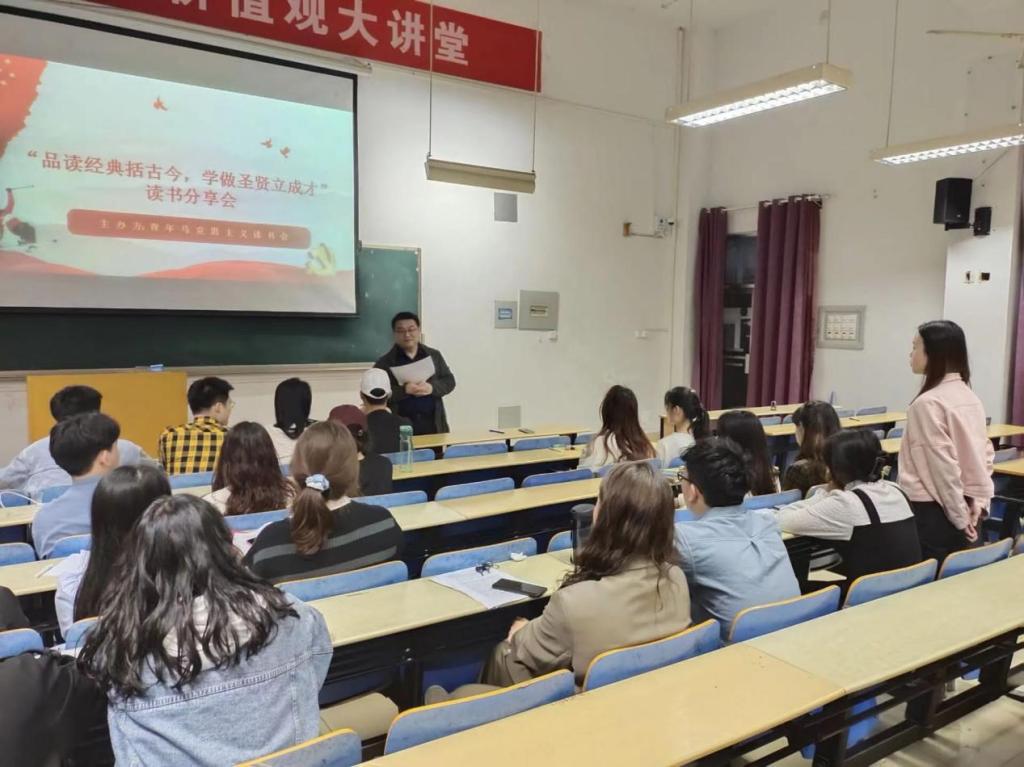 本网讯(通讯员/王佳仪)4月11日晚,青年马克思主义读书会在14号教学楼举办“品读经典括古今,学做圣贤立成才”主题读书分享会,读书会部分成员和范蠡商学院学生工作负责人参加分享会。