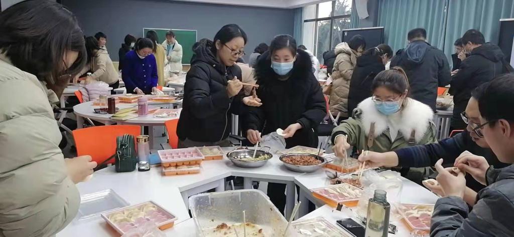 第二个环节是包饺子,到场教师全员参与。包饺子时,大家有的拿着手机拍照、录像,有的趁机把面粉抹在别人脸上,教室里充满了欢声笑语,成了一片欢乐的海洋。