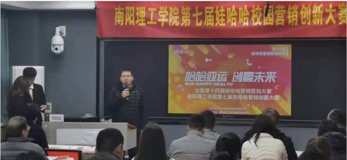 2021年12月10日下午7:00,南阳理工学院第七届娃哈哈校园营销创新大赛在1号教学楼1315举行。本次大赛是由杭州娃哈哈集团与南阳理工学院市场营销教研室、营销与策划协会共同举办。范蠡商学院郭永奇副院长、娃哈哈集团南阳分公司尚亚奇经理分别致辞。市场营销教研室全体教师作为评委出席活动。