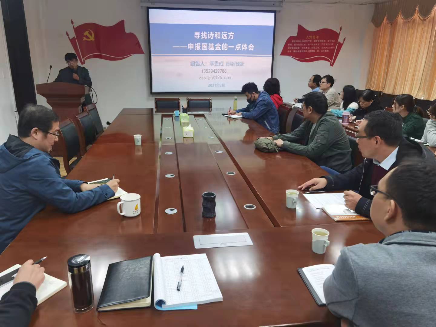 李贵成从科研工作者的梦想立题,系统地从科研工作者不忘初心的使命和责任、秉承匠心的“疑、求、悟”三个阶段、坚持恒心方能云开等内容深入浅出地介绍了申报国家社科基金课题的科研工作实践体会。报告会结束后,李贵成结合参会博士教师关心的科研问题进行了深入的交流。