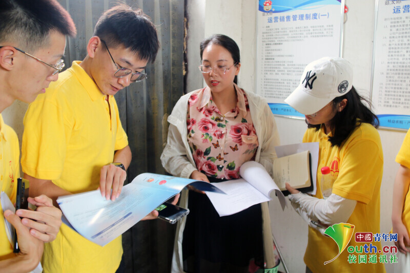 图为老师与负责人了解菇产品包装及产量情况。中国青年网通讯员 杨志豪 摄