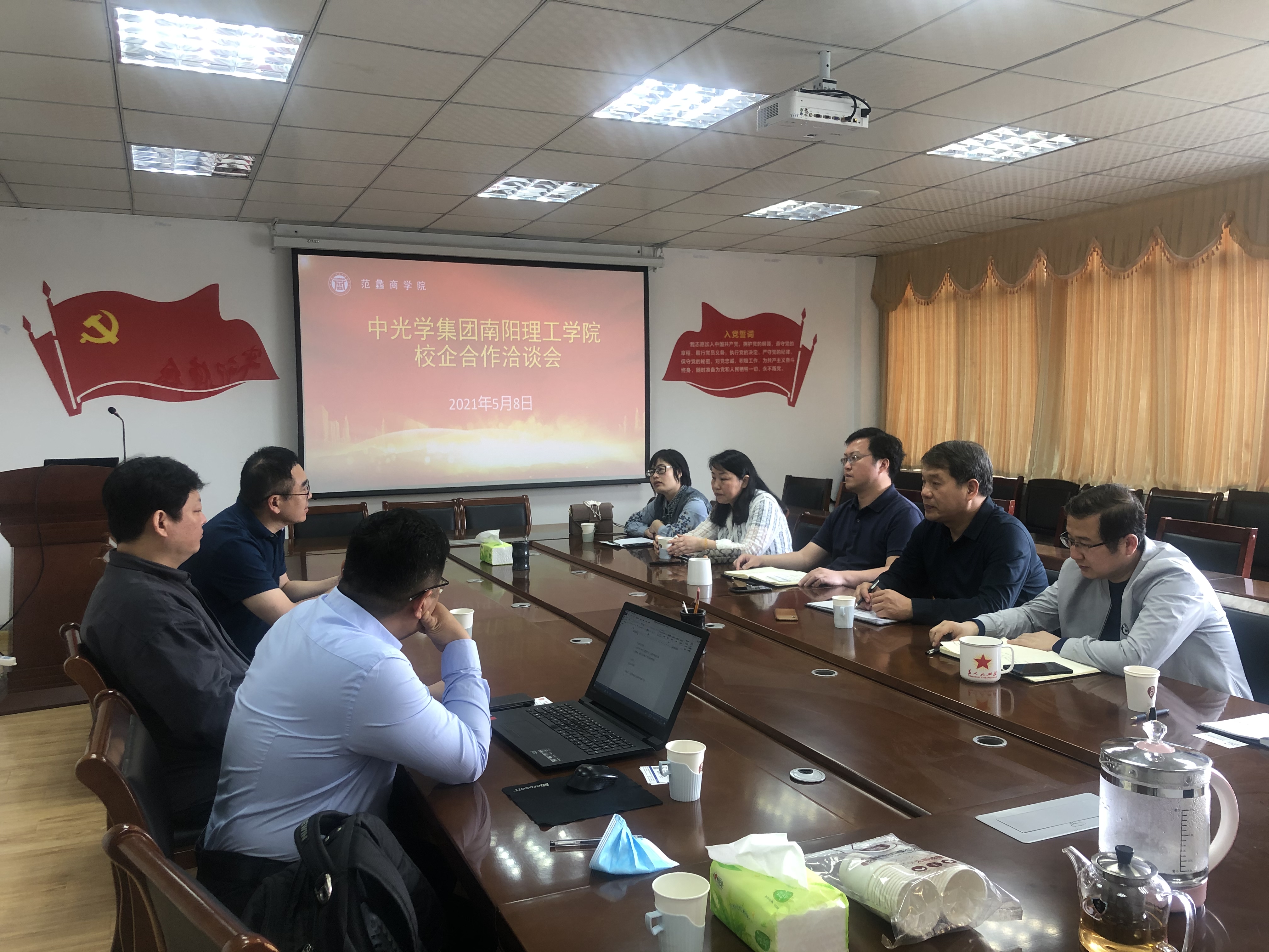 本网讯(记者/李浩)5月8日,中光学集团股份有限公司总公司人力资源部部长宋亚军,子公司河南中富康数显有限公司总经理于健、营销二部部长王高杰一行来我校洽谈校企合作。范蠡商学院负责人及部分专业教师出席了洽谈会。